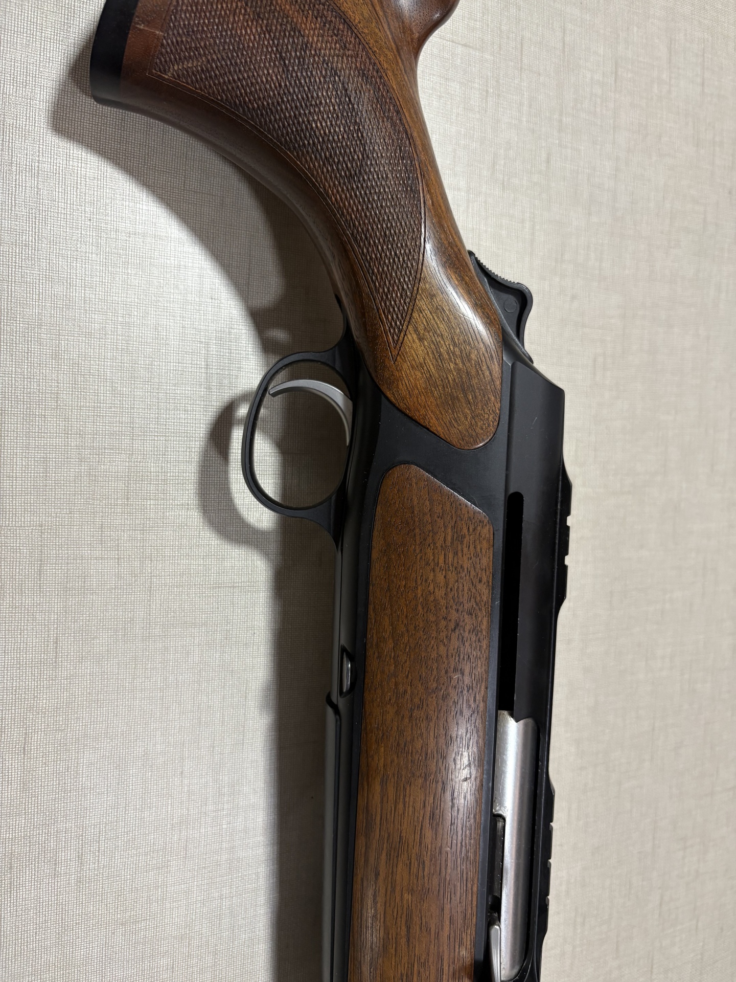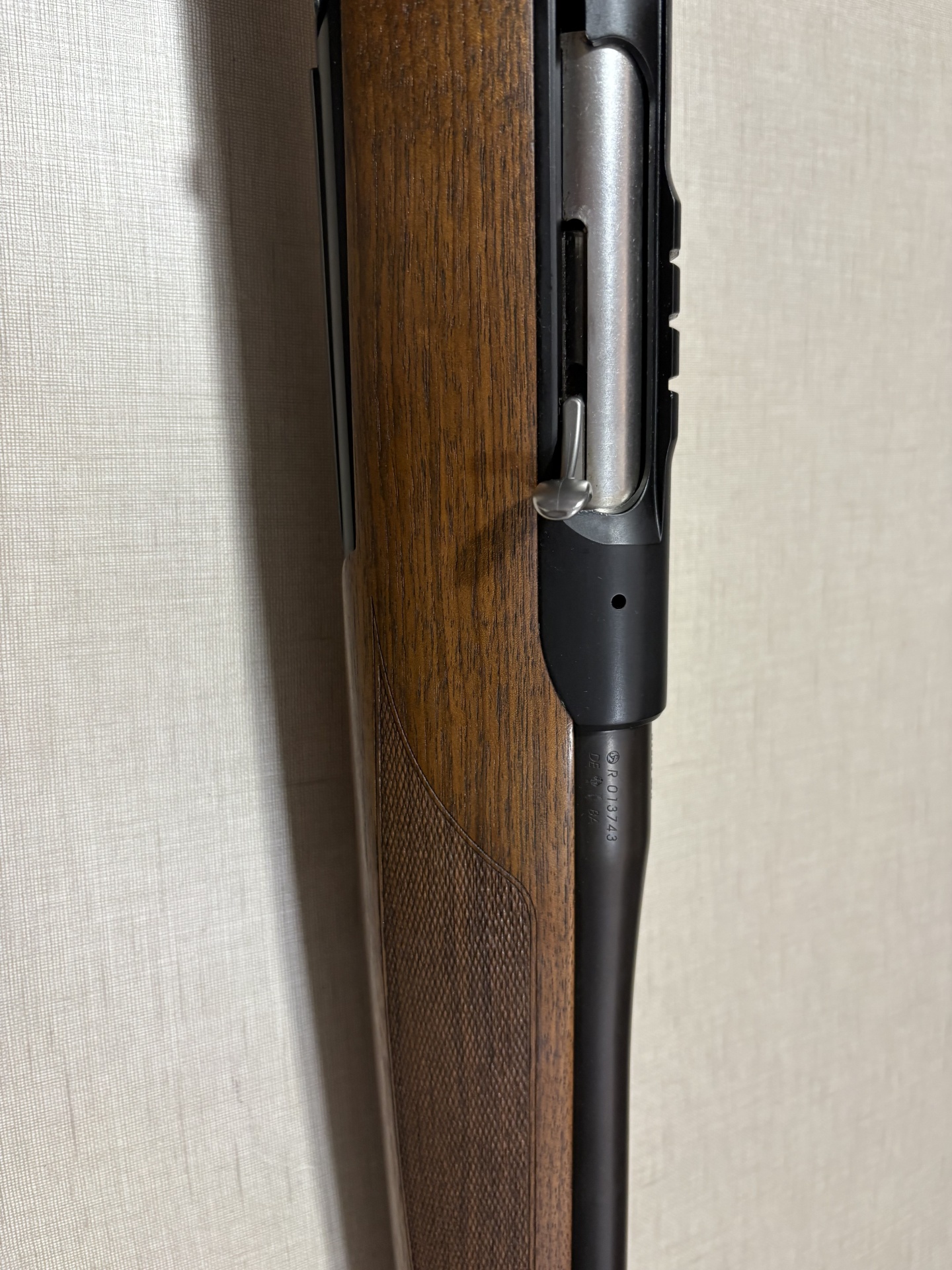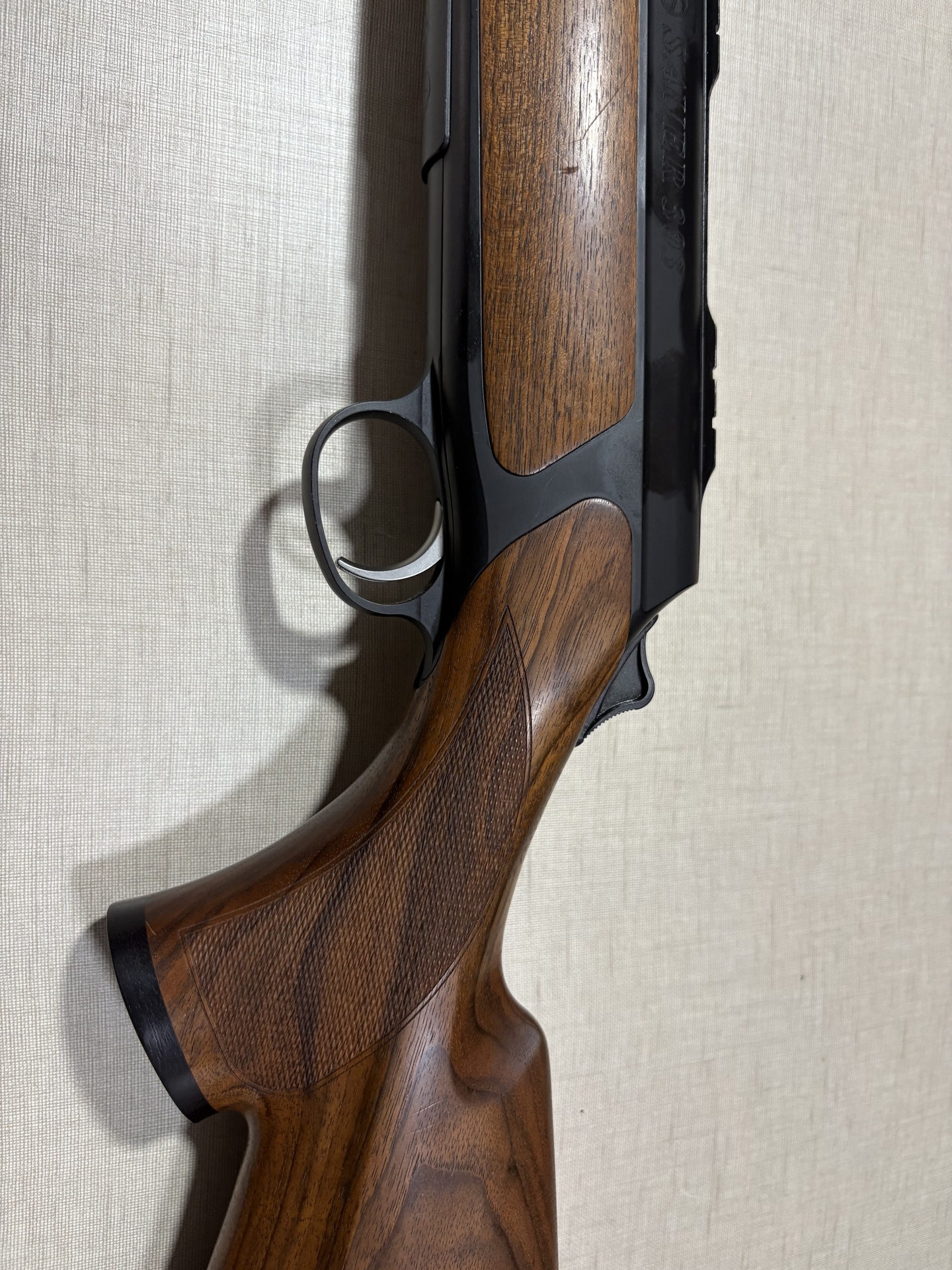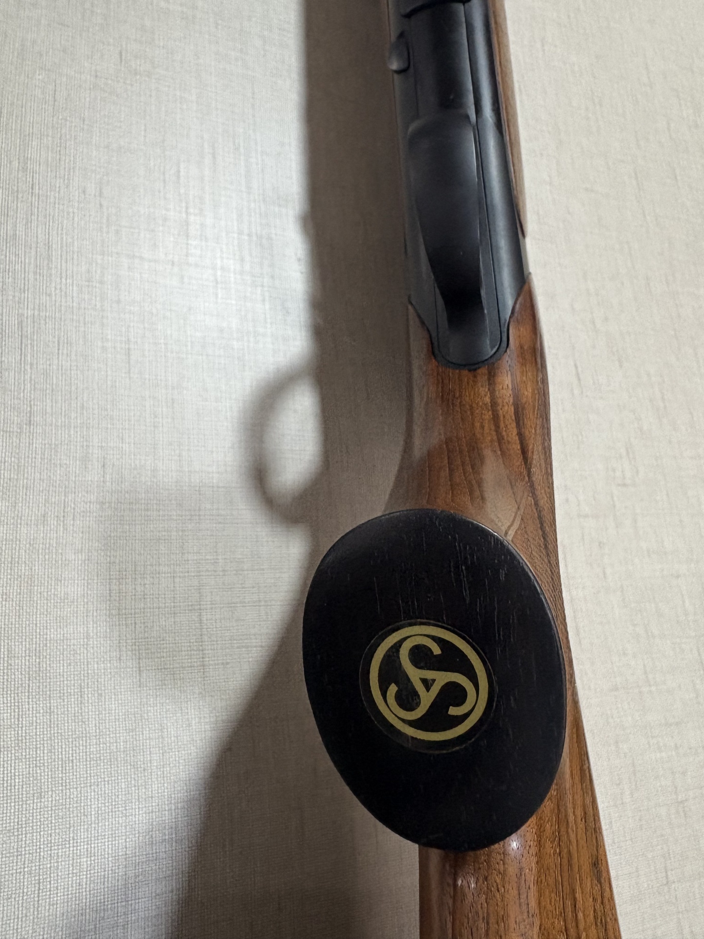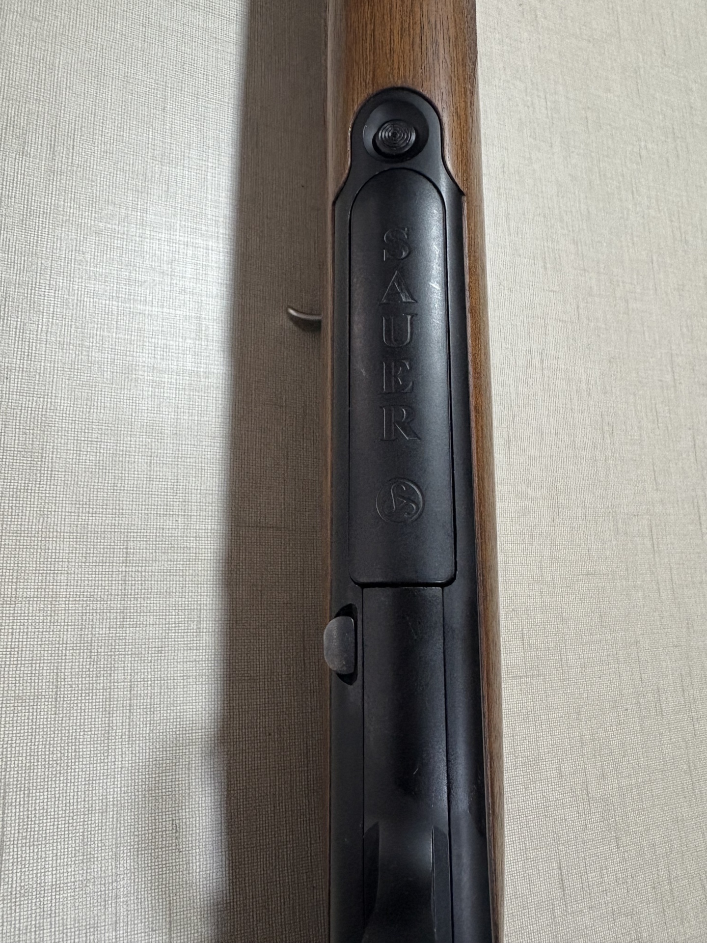 Detalhe da parte superior de uma espingarda com metal preto e gravação SAUER