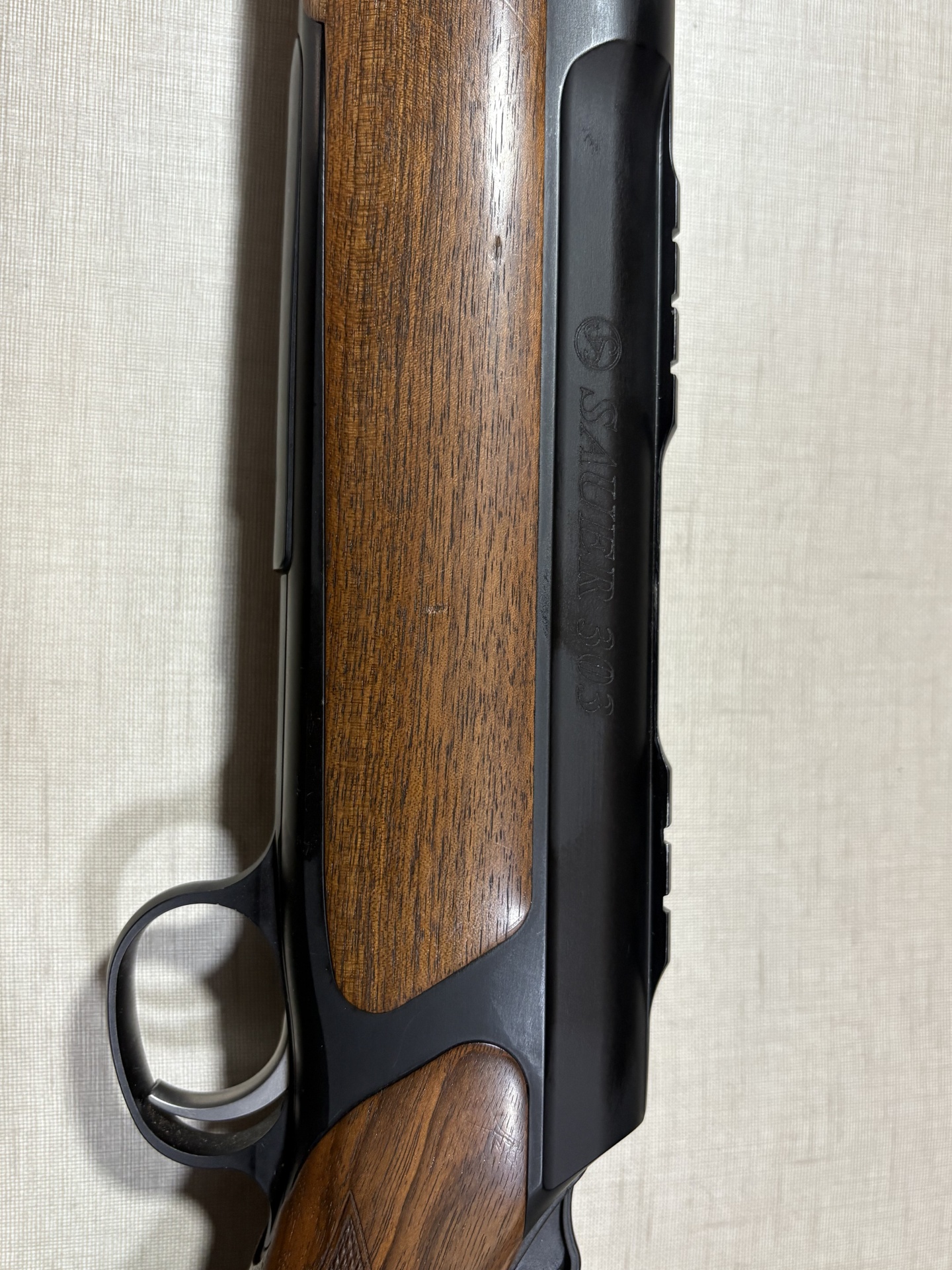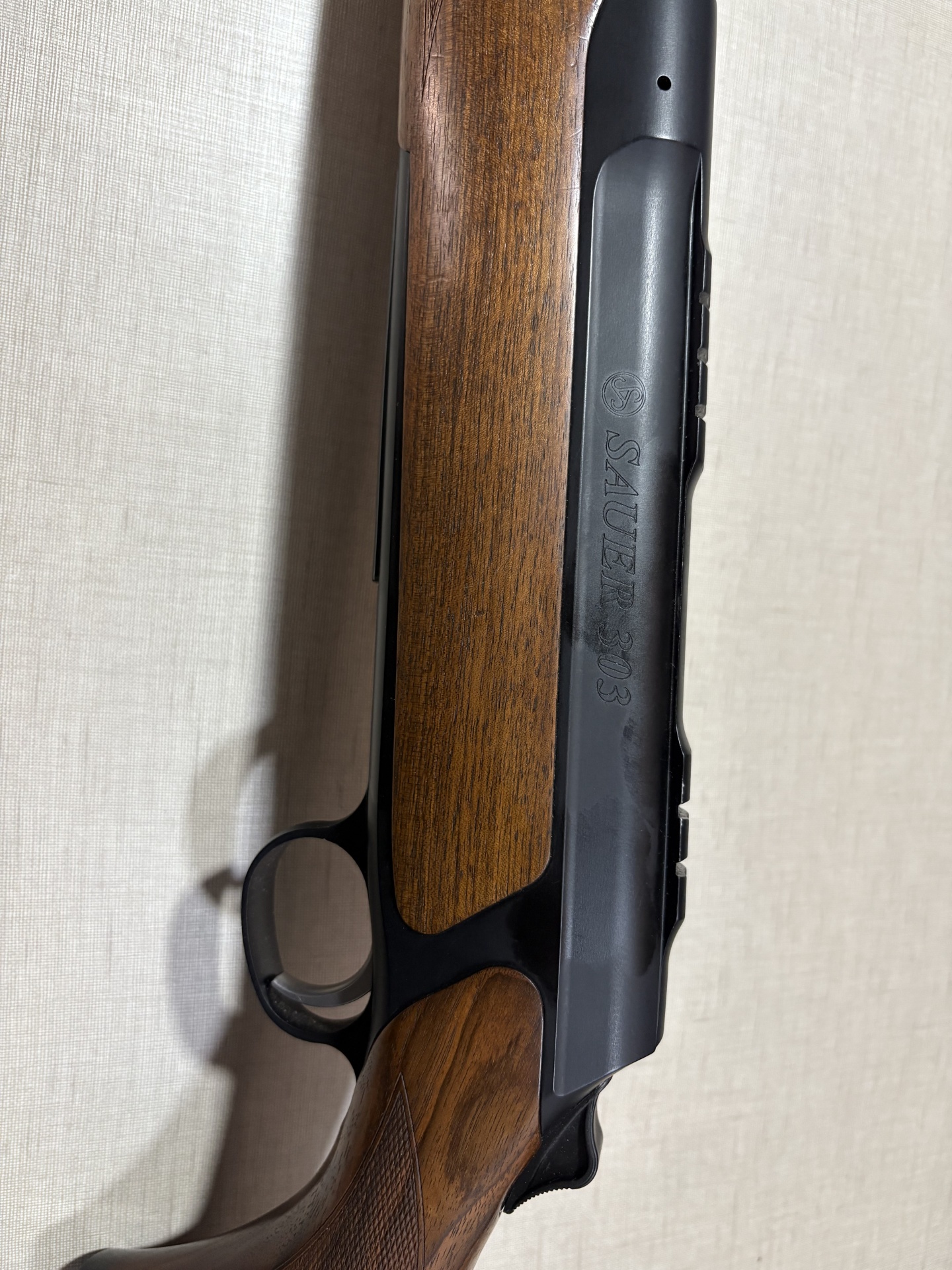 Carabina com partes em madeira e metal preto com texto SAUER 303