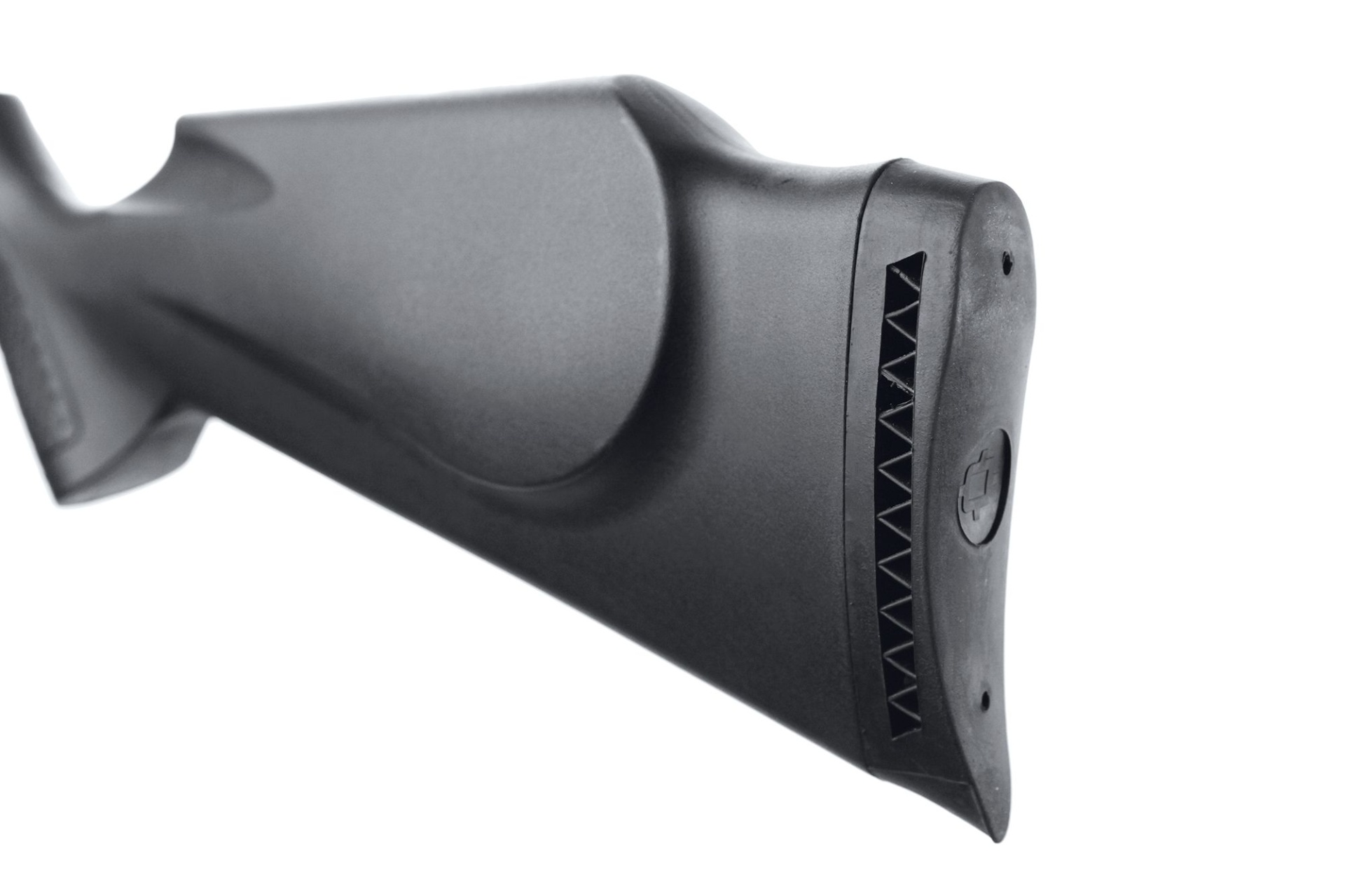 Carabina preta com detalhes texturados e símbolo branco de mira