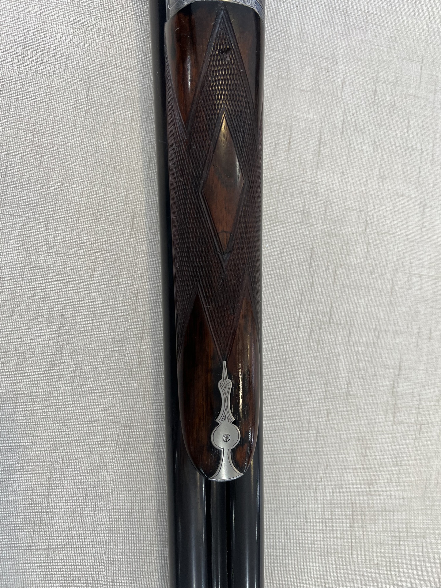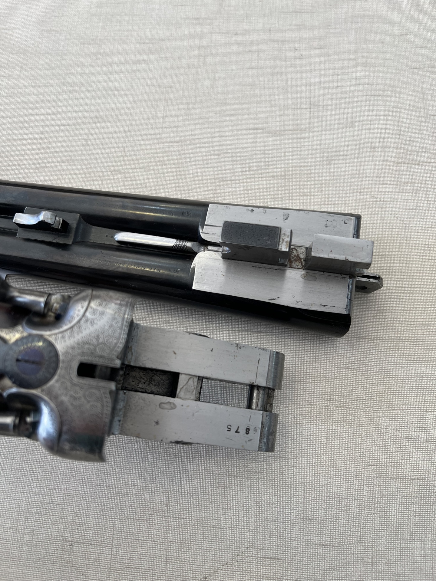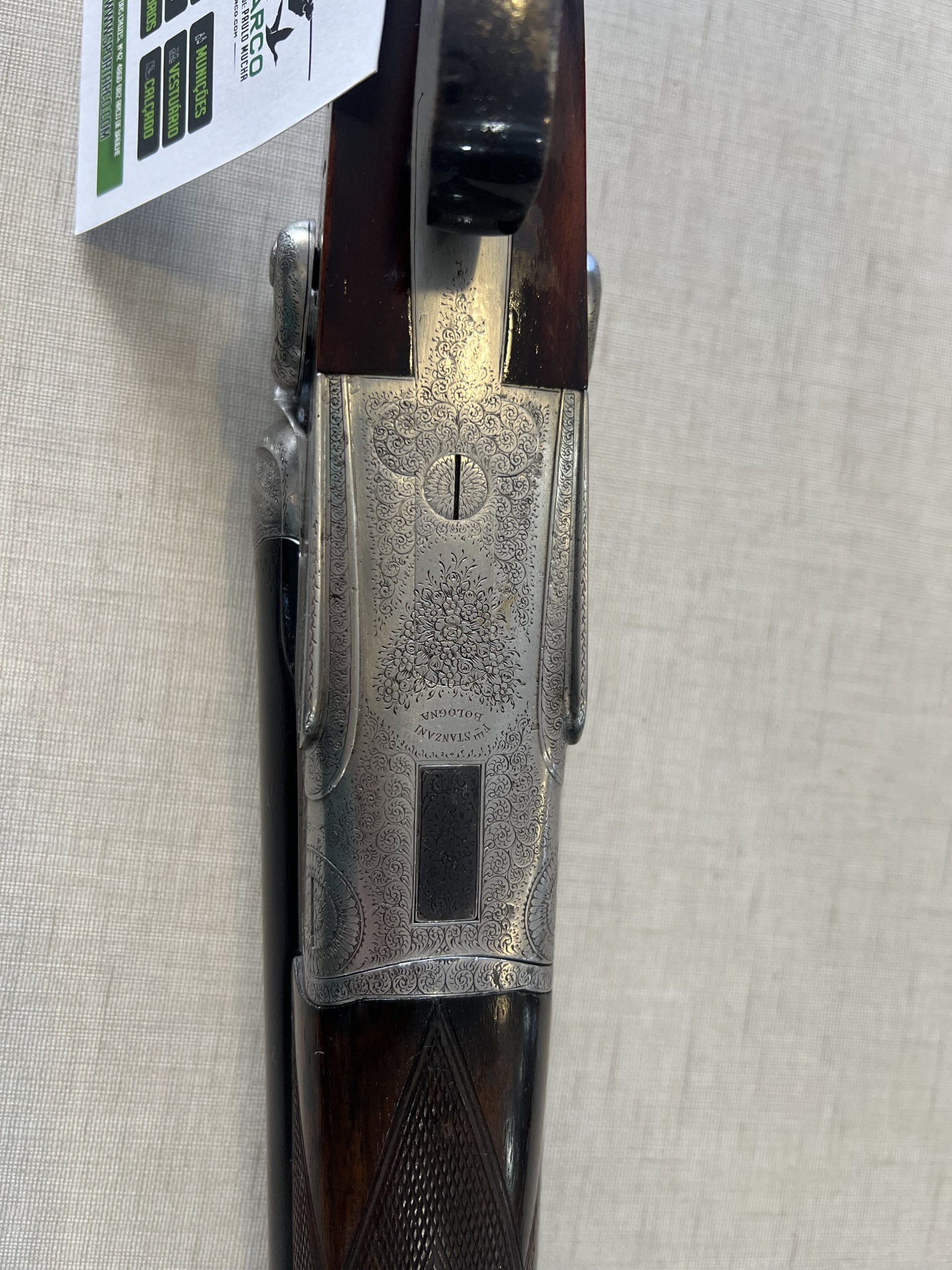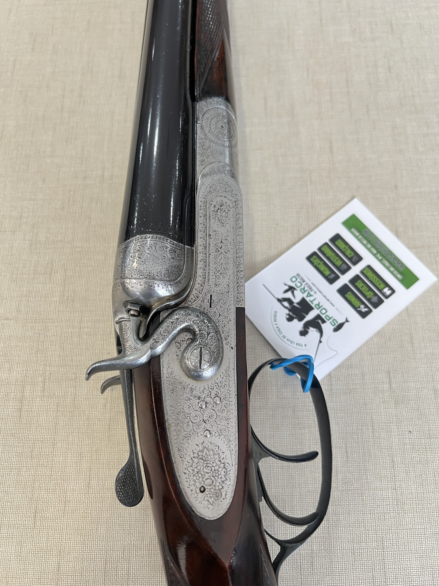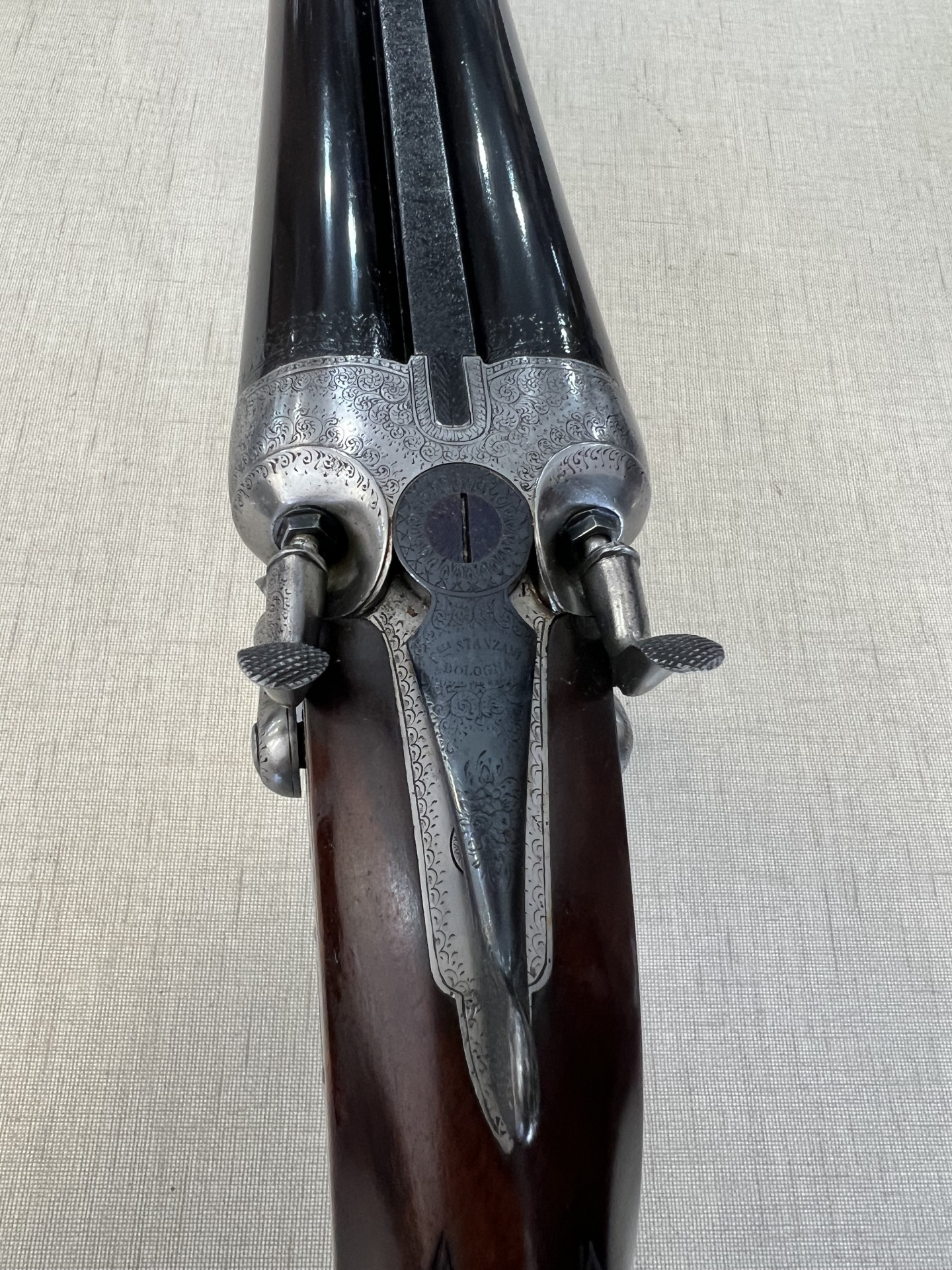 Espingarda de canos duplos com detalhes gravados em metal e madeira escura