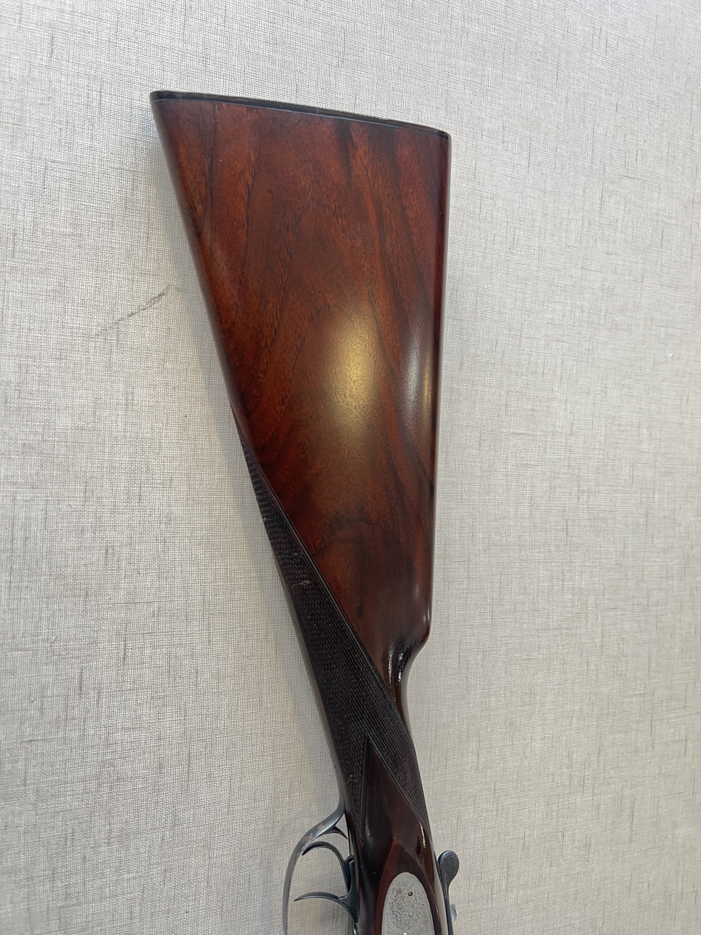 Coronha de espingarda em madeira castanho-escuro com padrão quadriculado na empunhadura