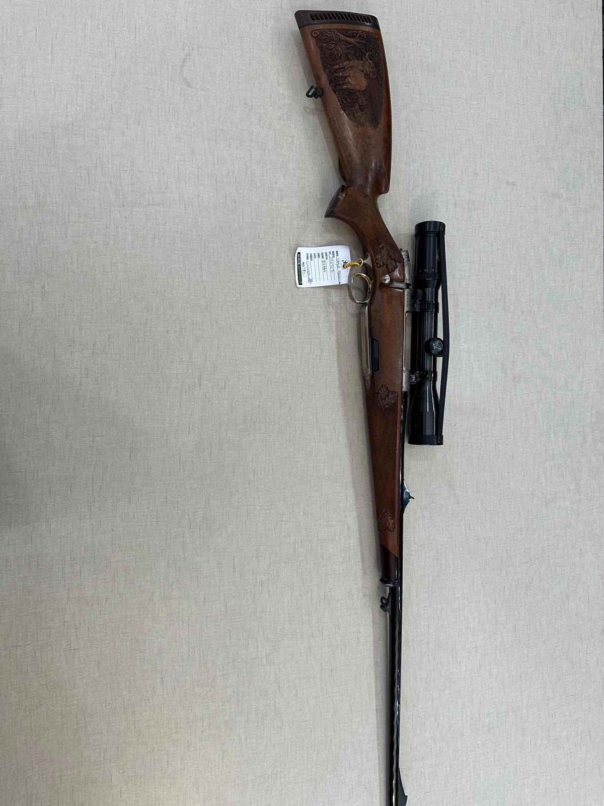Rifle de madeira e metal com entalhes decorativos e visor óptico