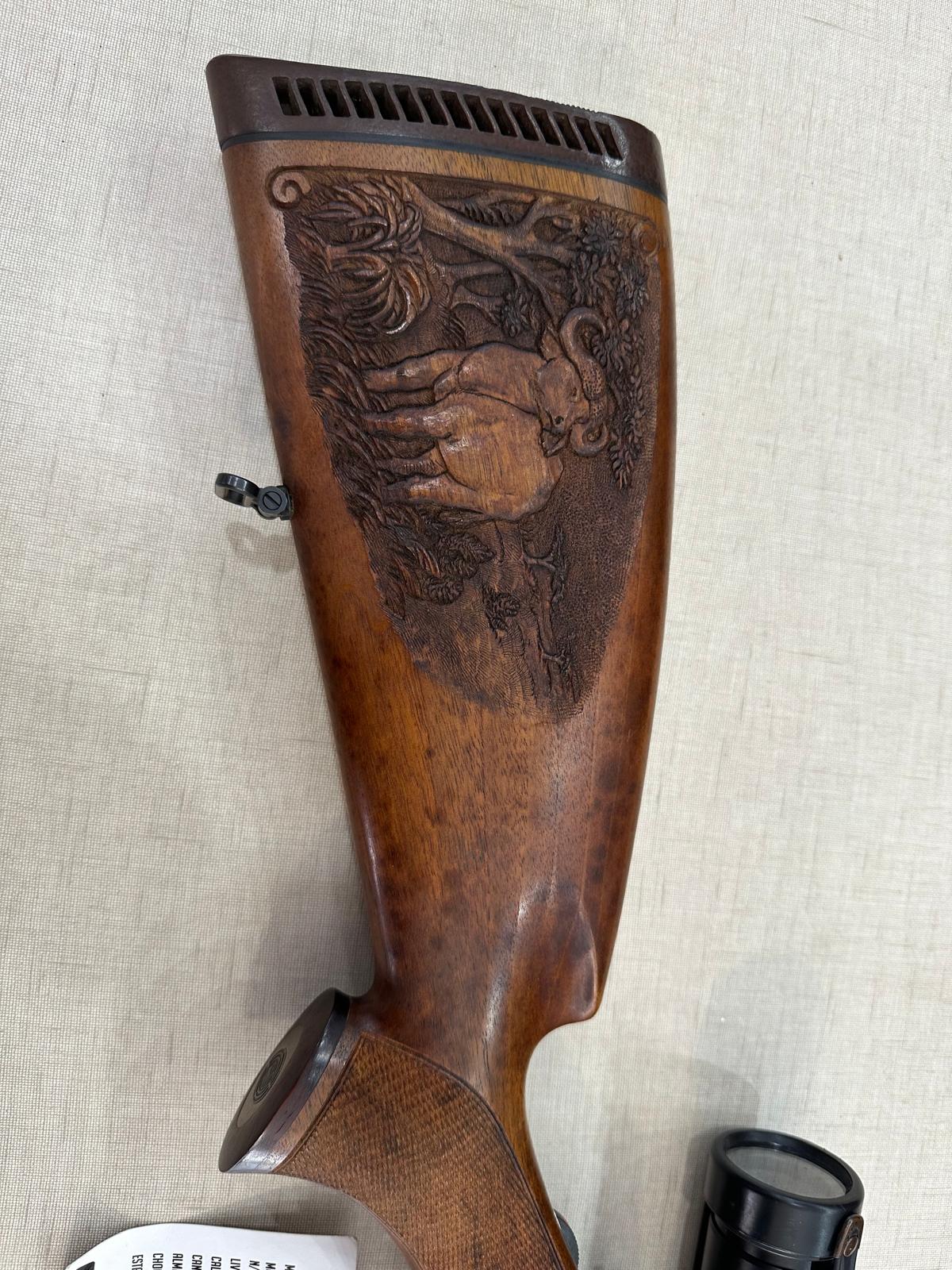 Rifle com coronha em madeira trabalhada e acabamento metálico prateado com gravações e mira telescópica preta.