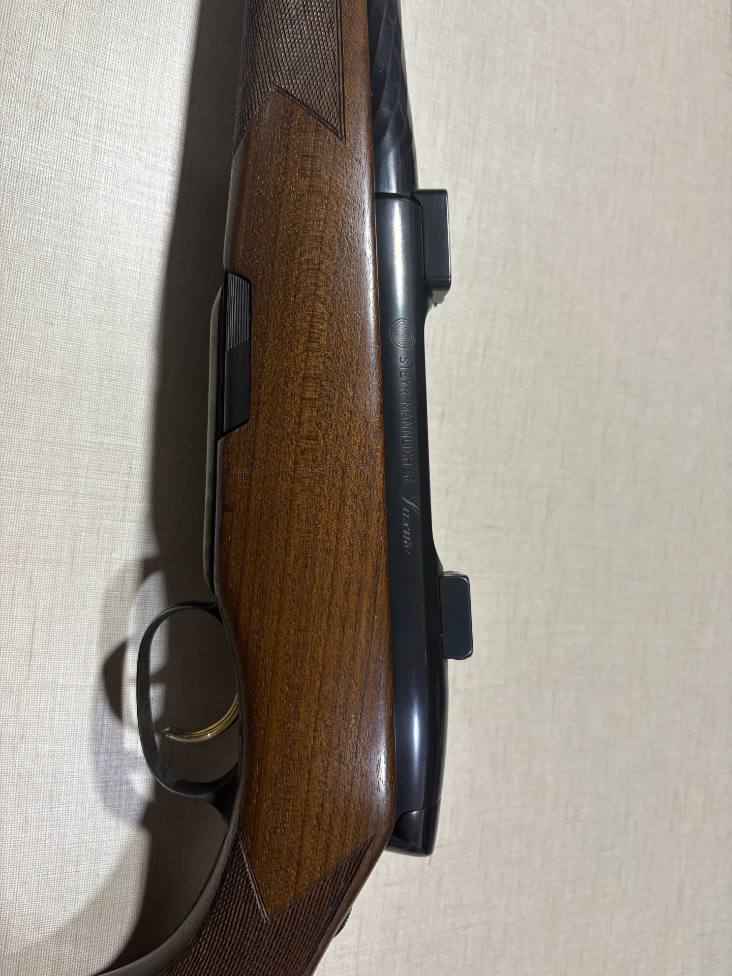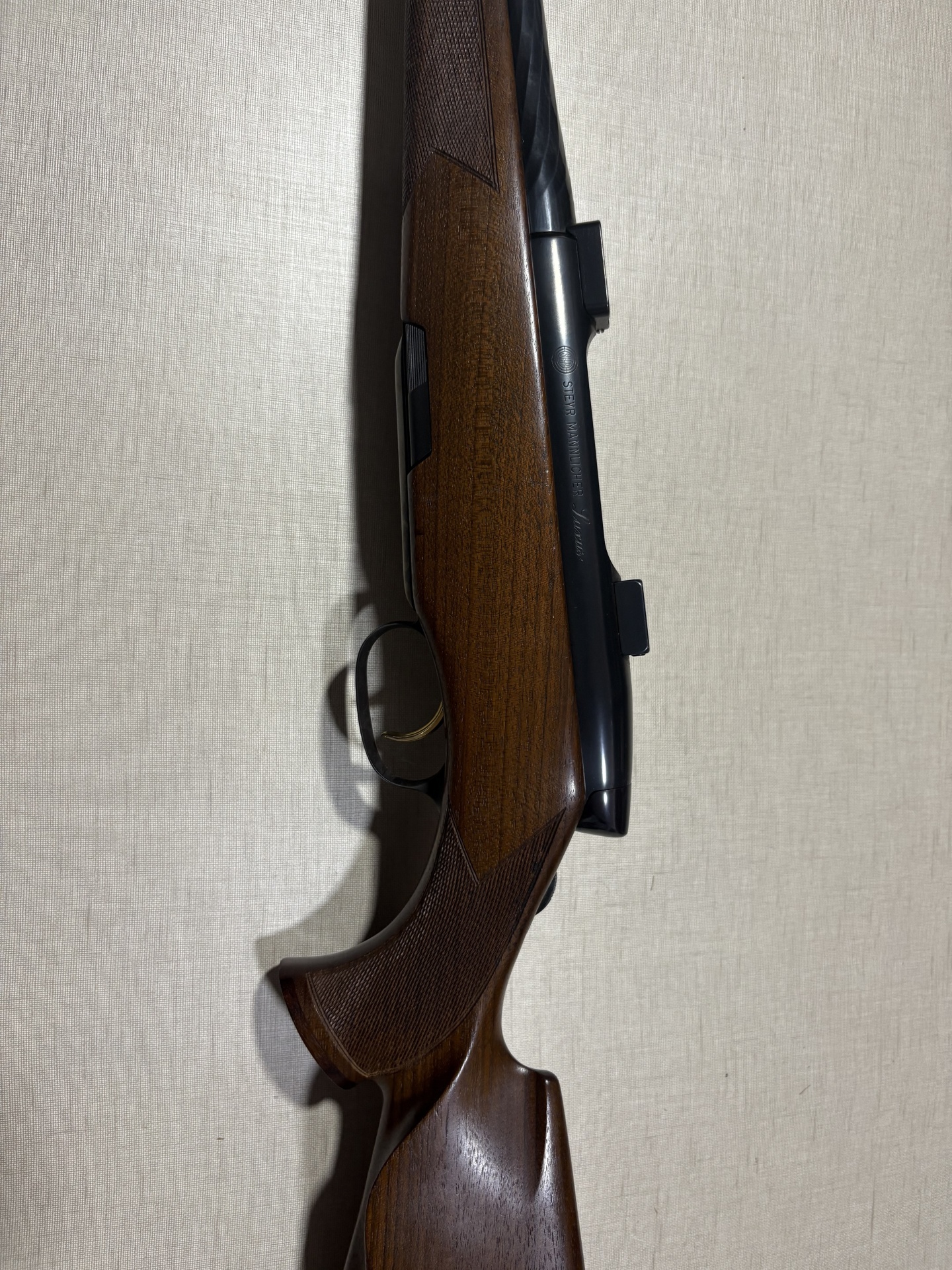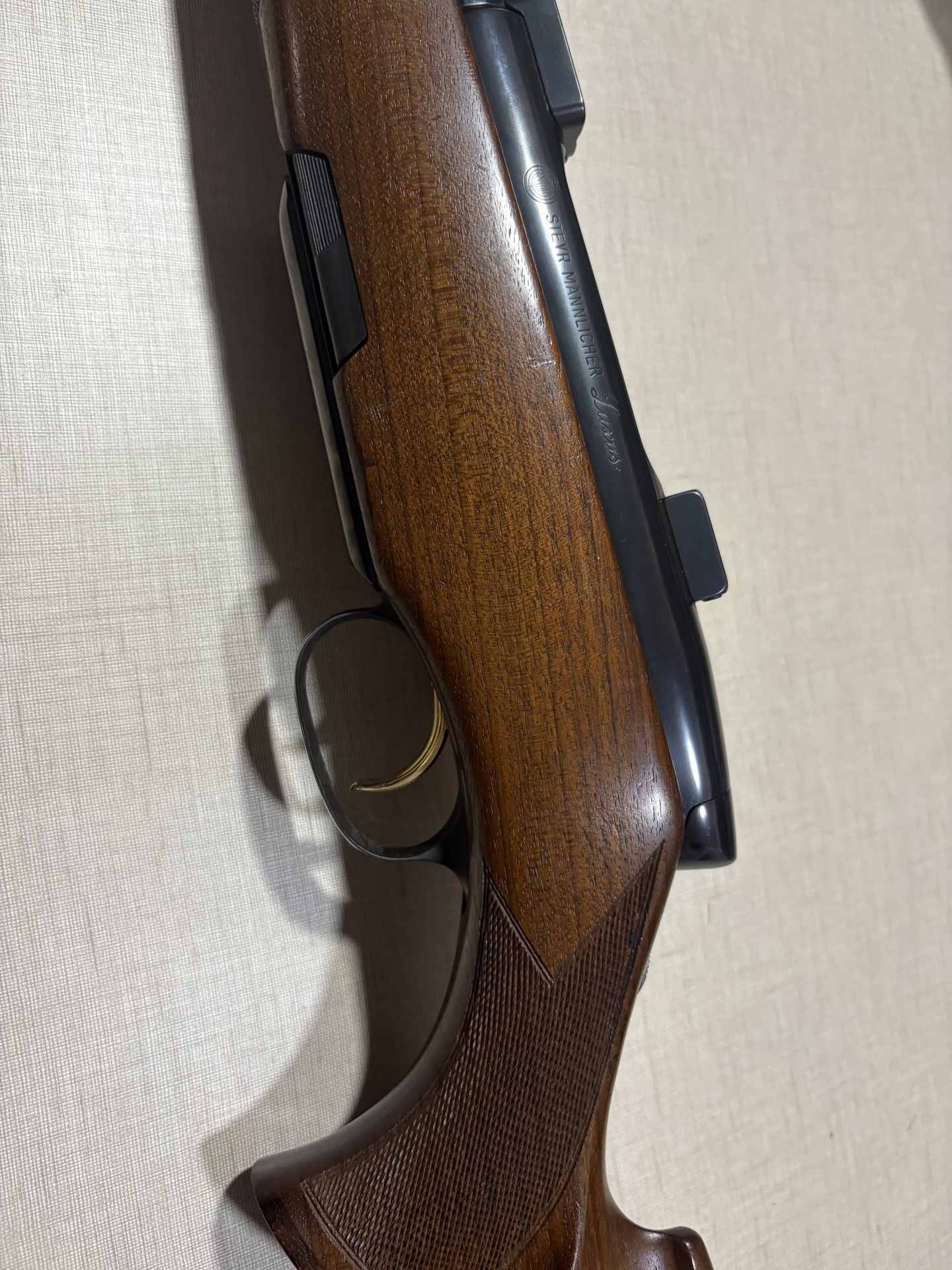 Espingarda com madeira castanha e metal preto com inscrição Steyr Mannlicher Luxus.