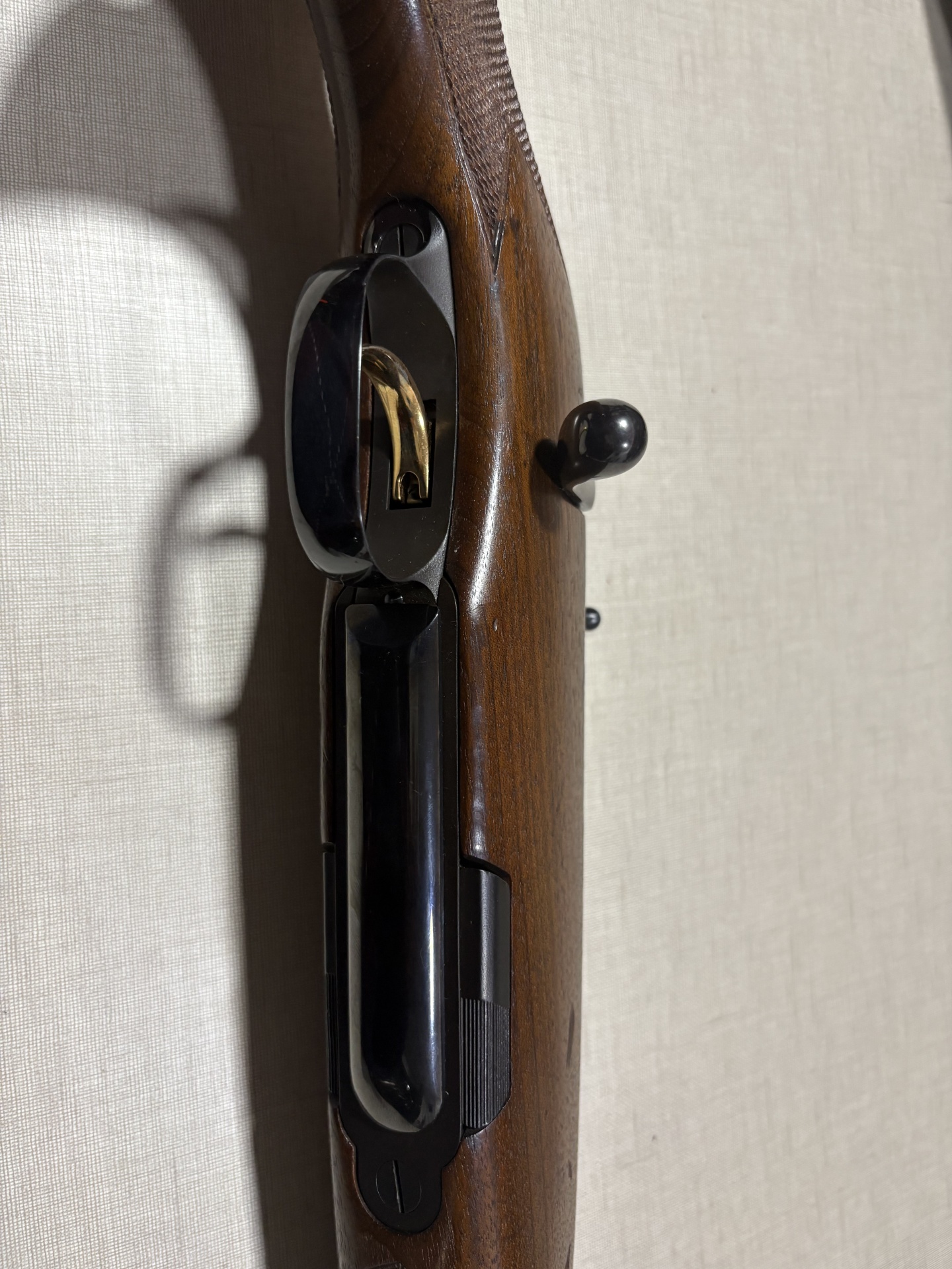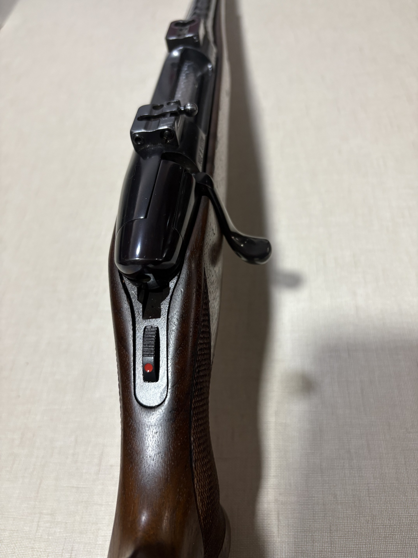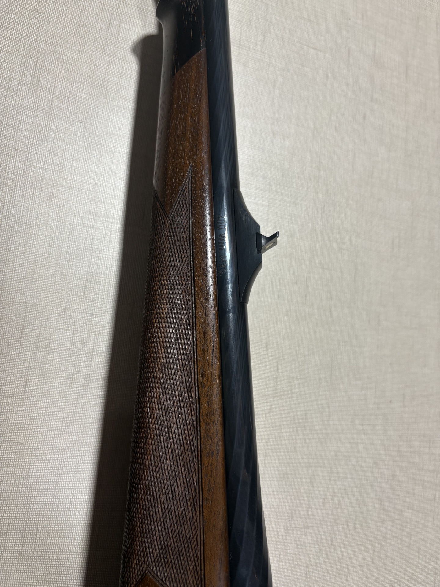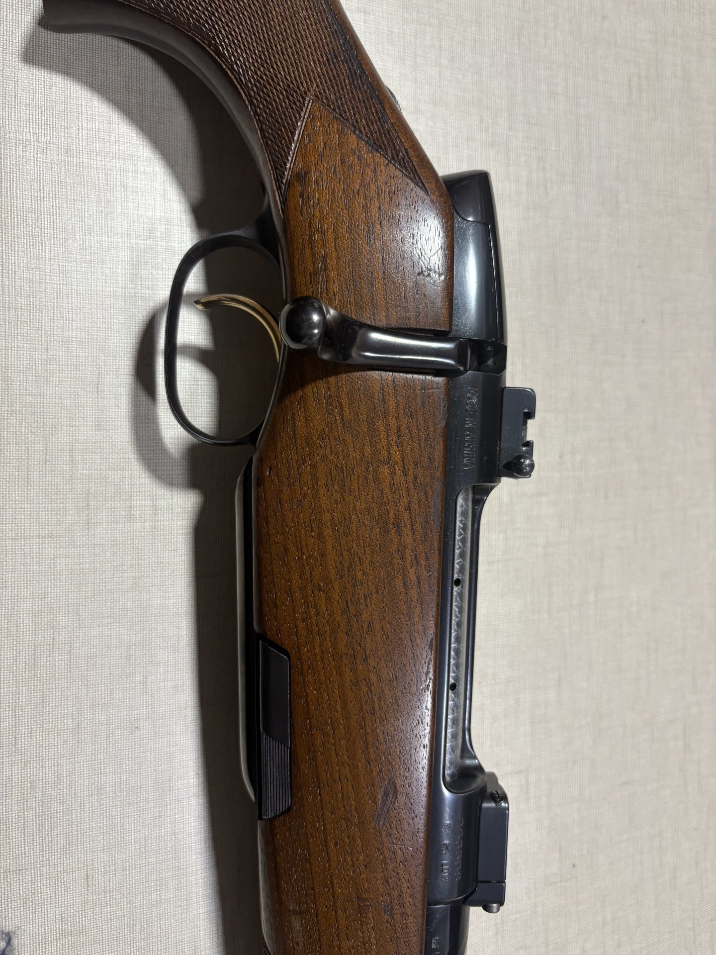 Espingarda com madeira castanha e metal preto com inscrição Steyr Mannlicher Luxus.