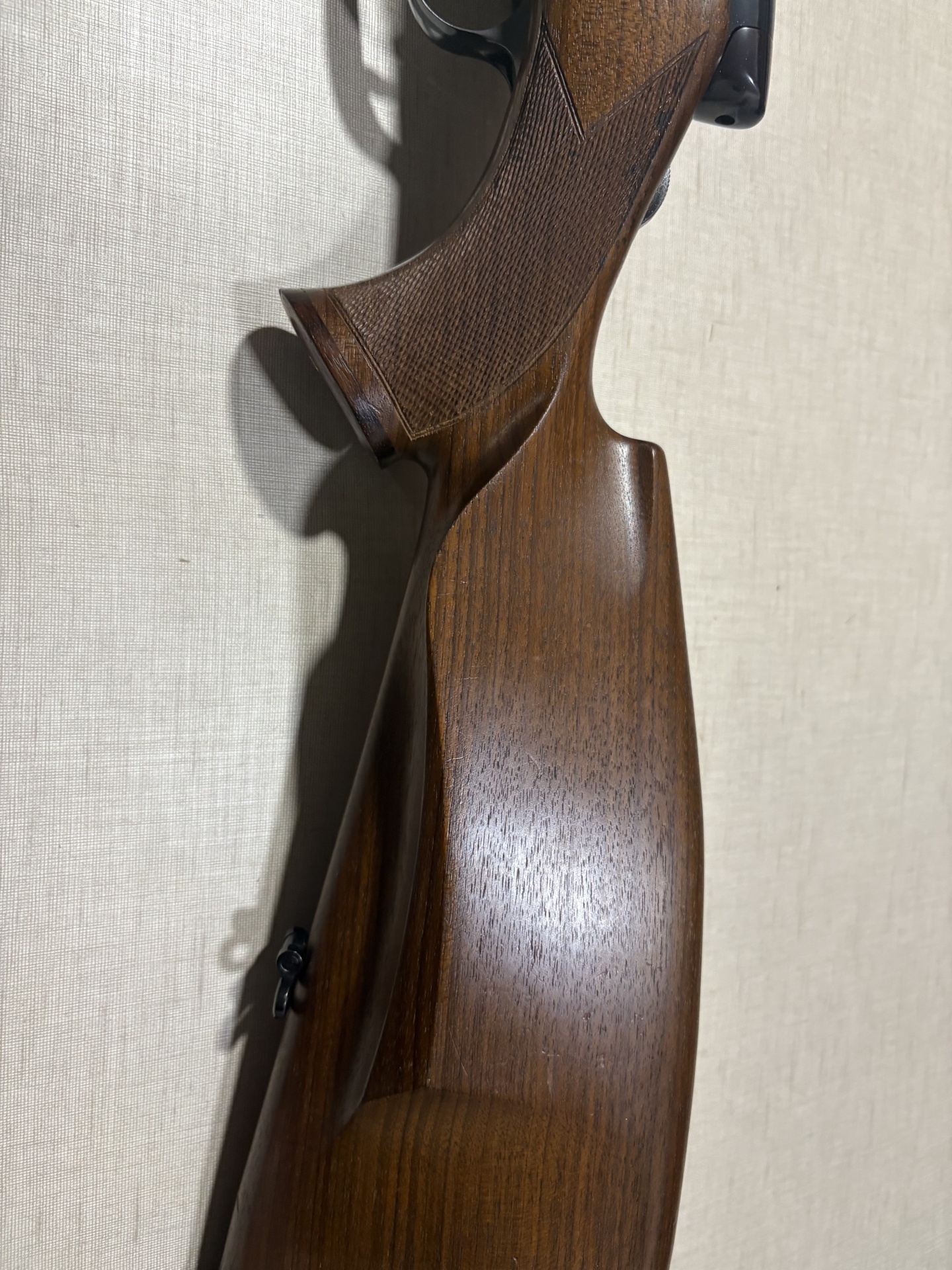 Coronha de arma de madeira polida com textura quadriculada e suporte metálico para alça