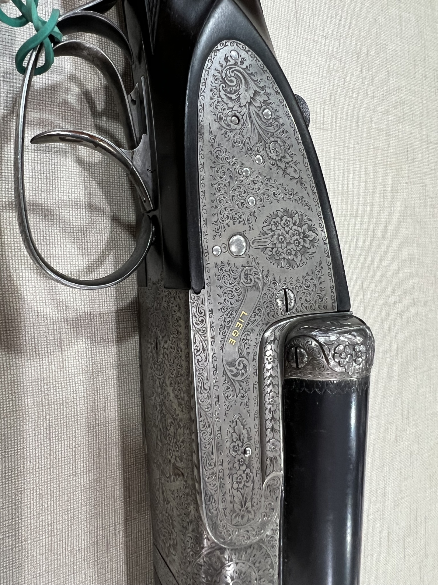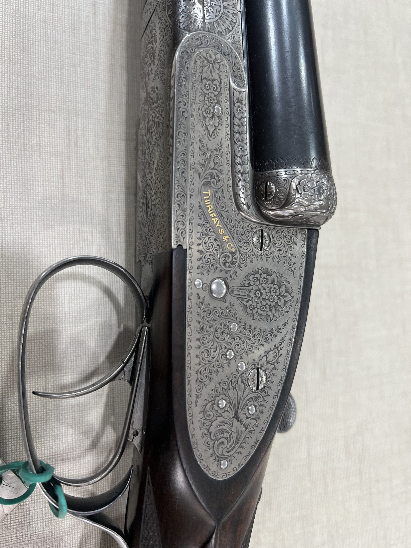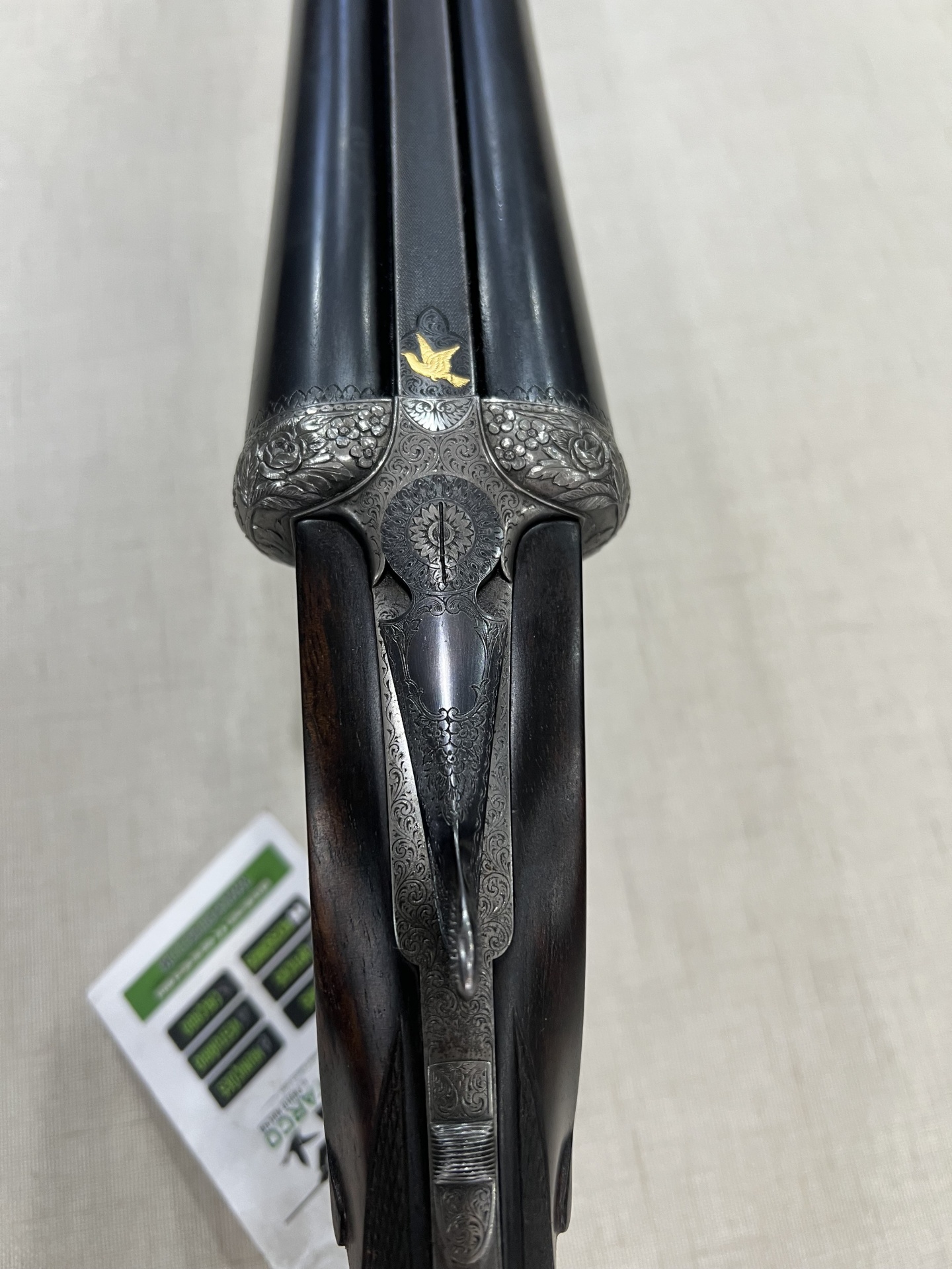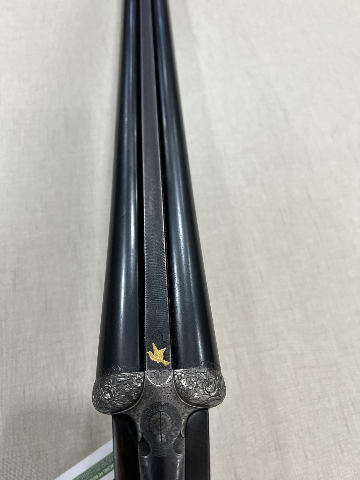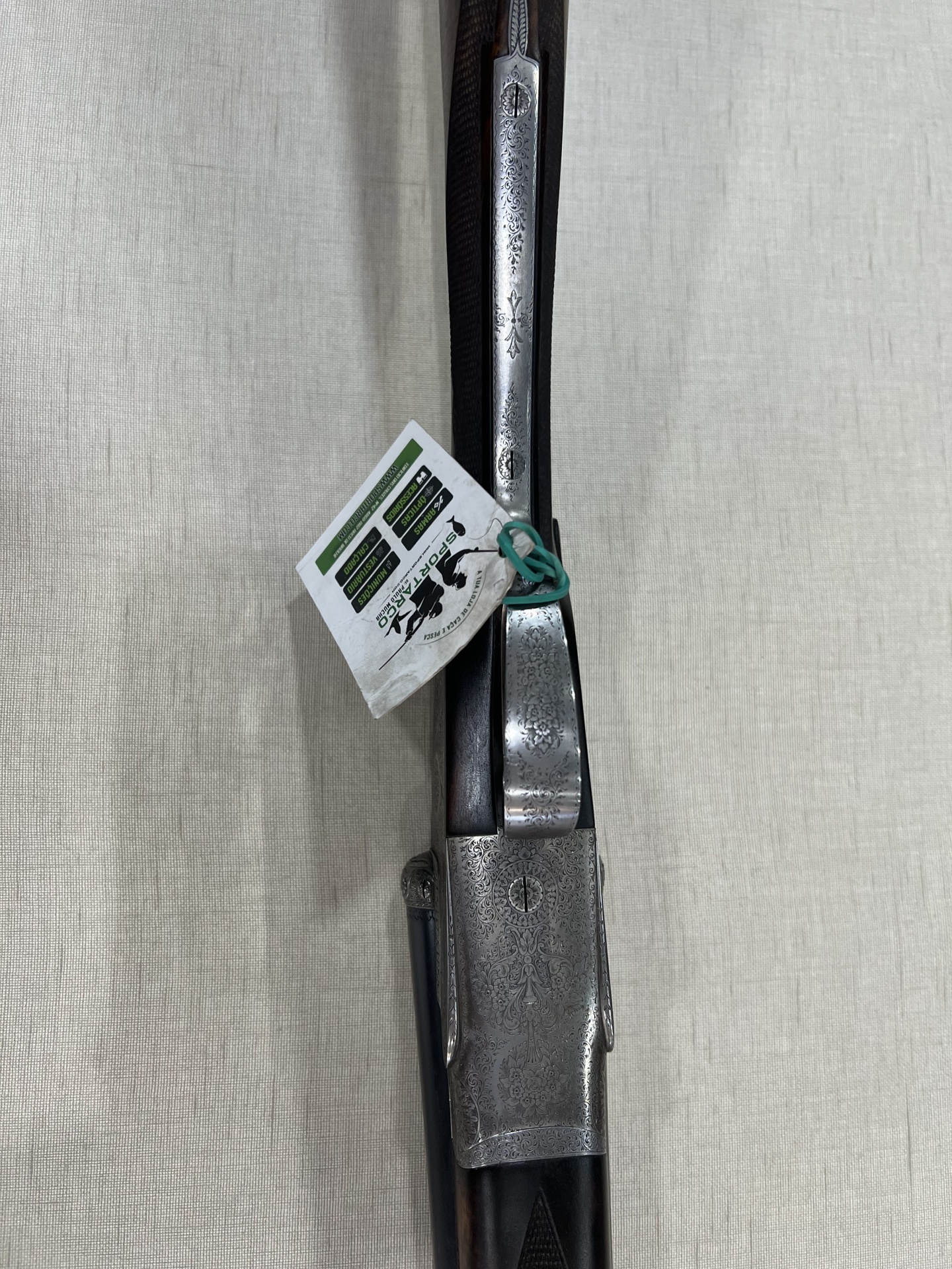 Espingarda de canos paralelos em metal preto com detalhes prateados e símbolo dourado sobre tecido bege