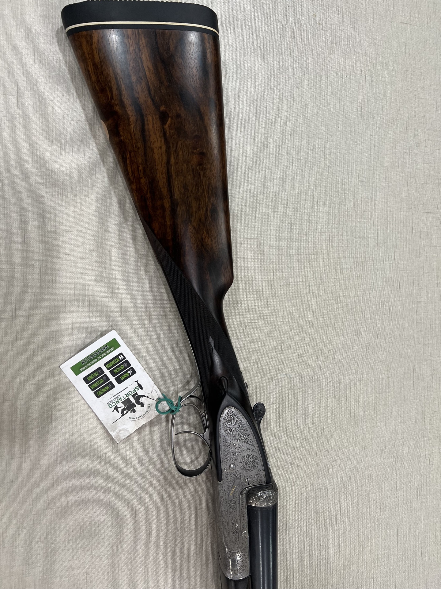 Espingarda de caça com detalhes metálicos gravados pendurada com cartão branco