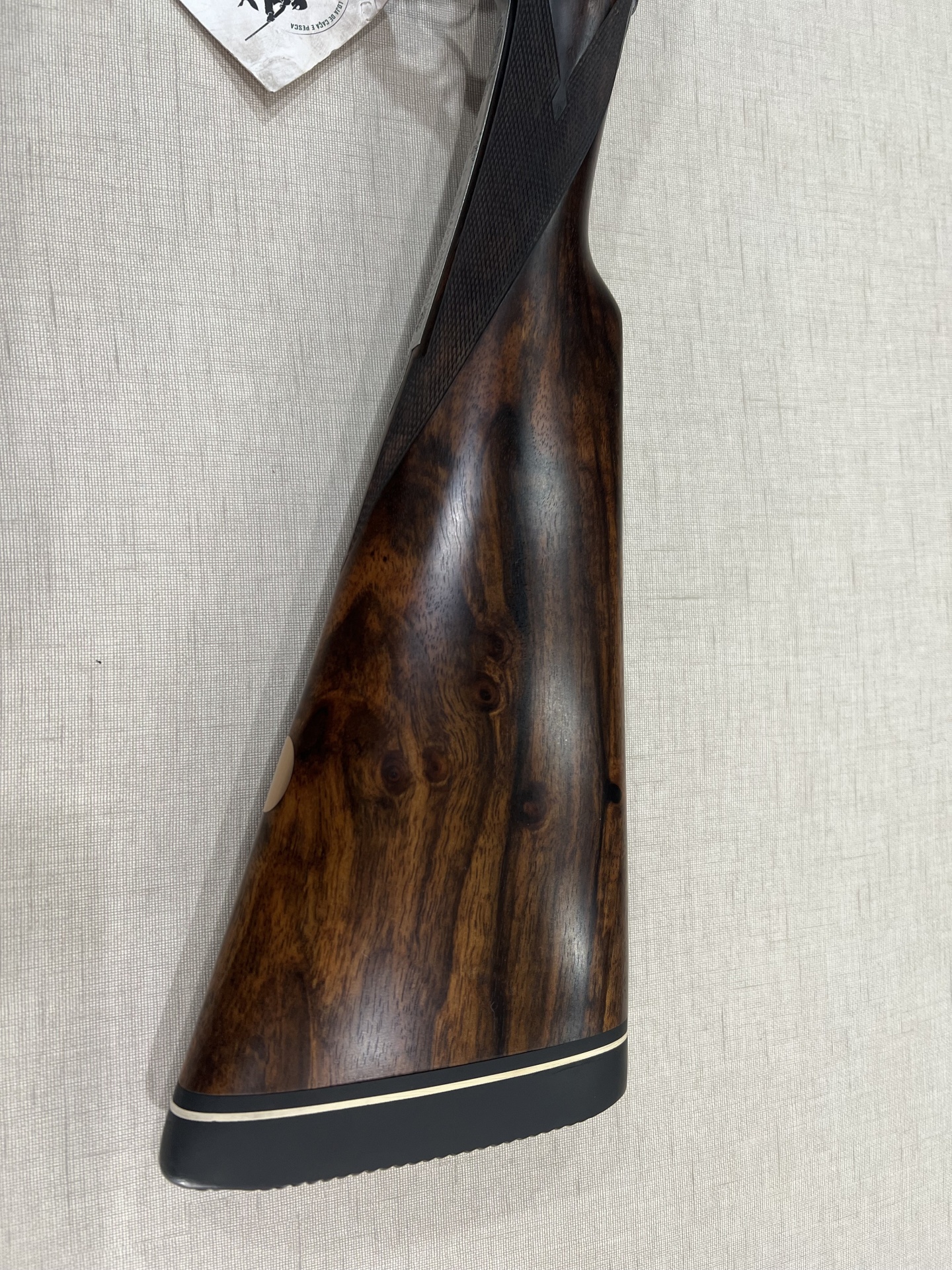 Coronha de espingarda em madeira castanha polida com base preta e faixa branca sobre tecido claro