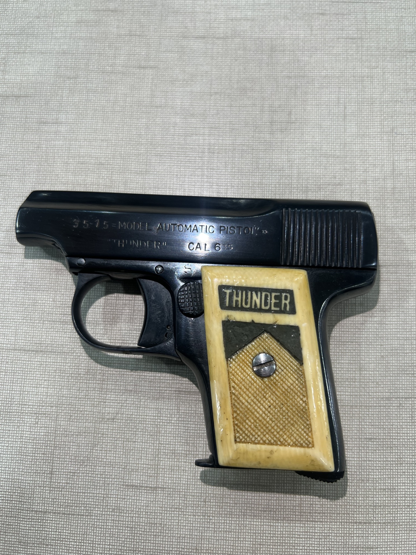 Revólver pequeno metal escuro com empunhadura clara e texto 'THUNDER'