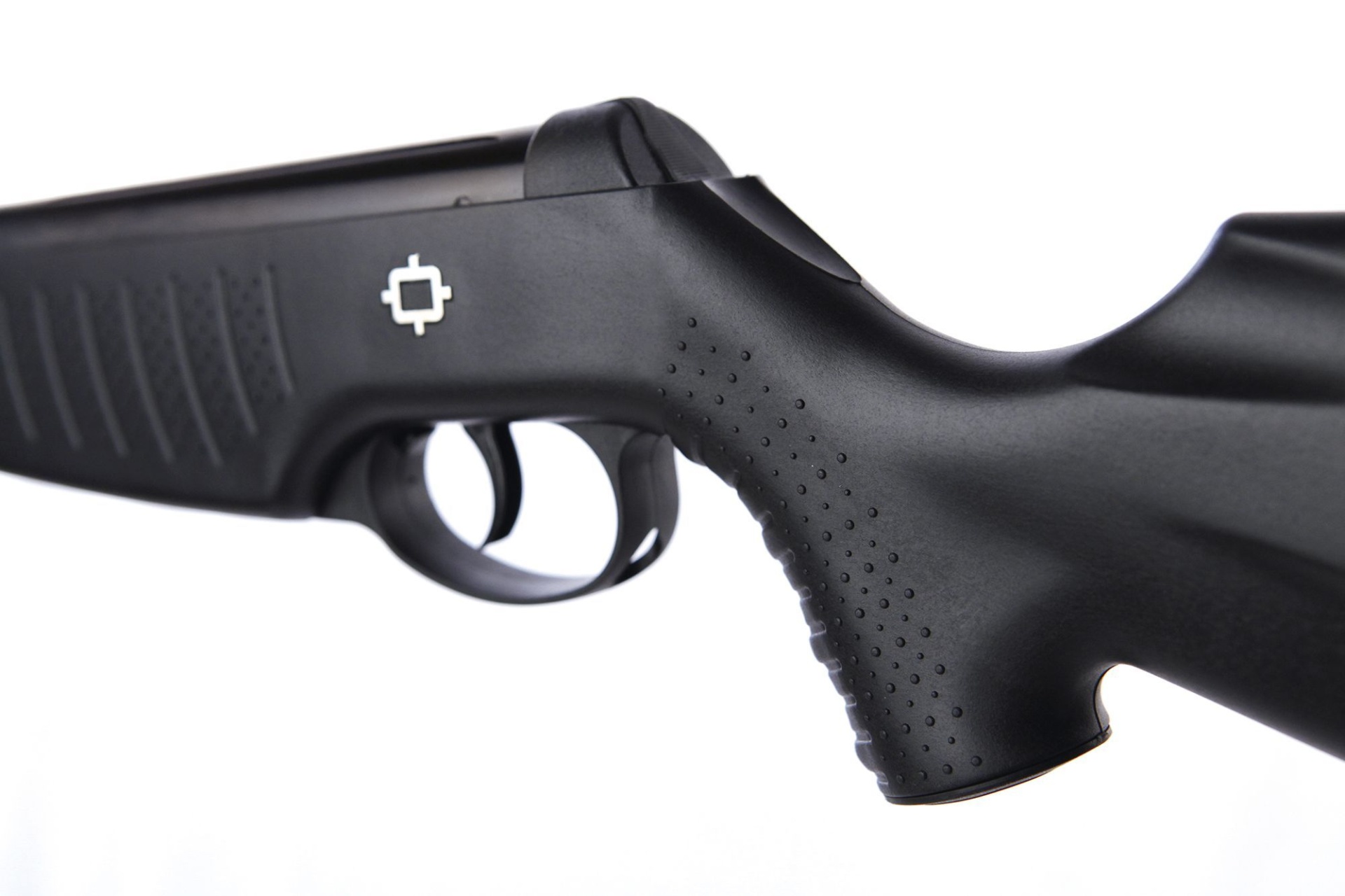Carabina de ar comprimido preta com coronha e empunhadura texturizadas.