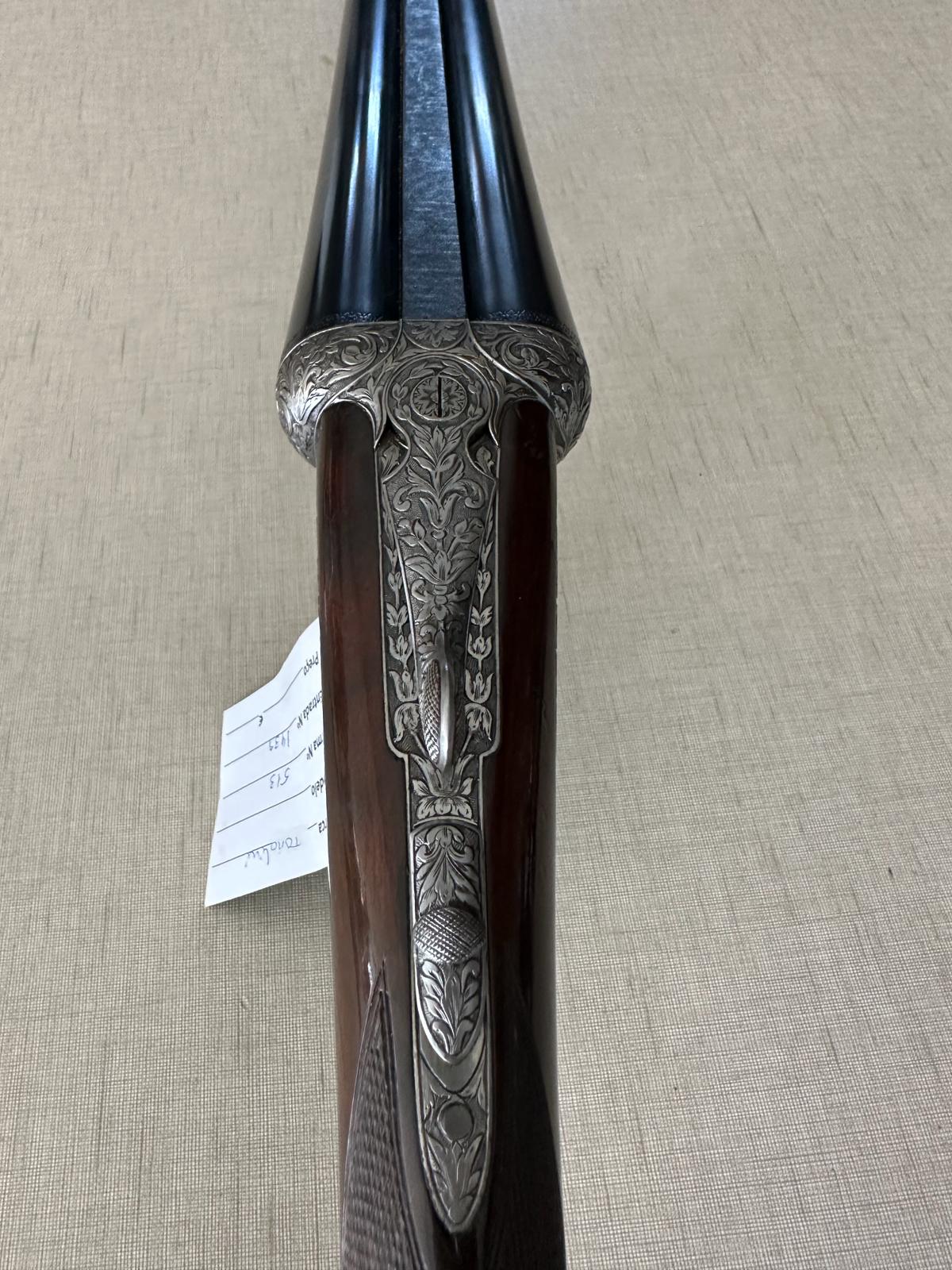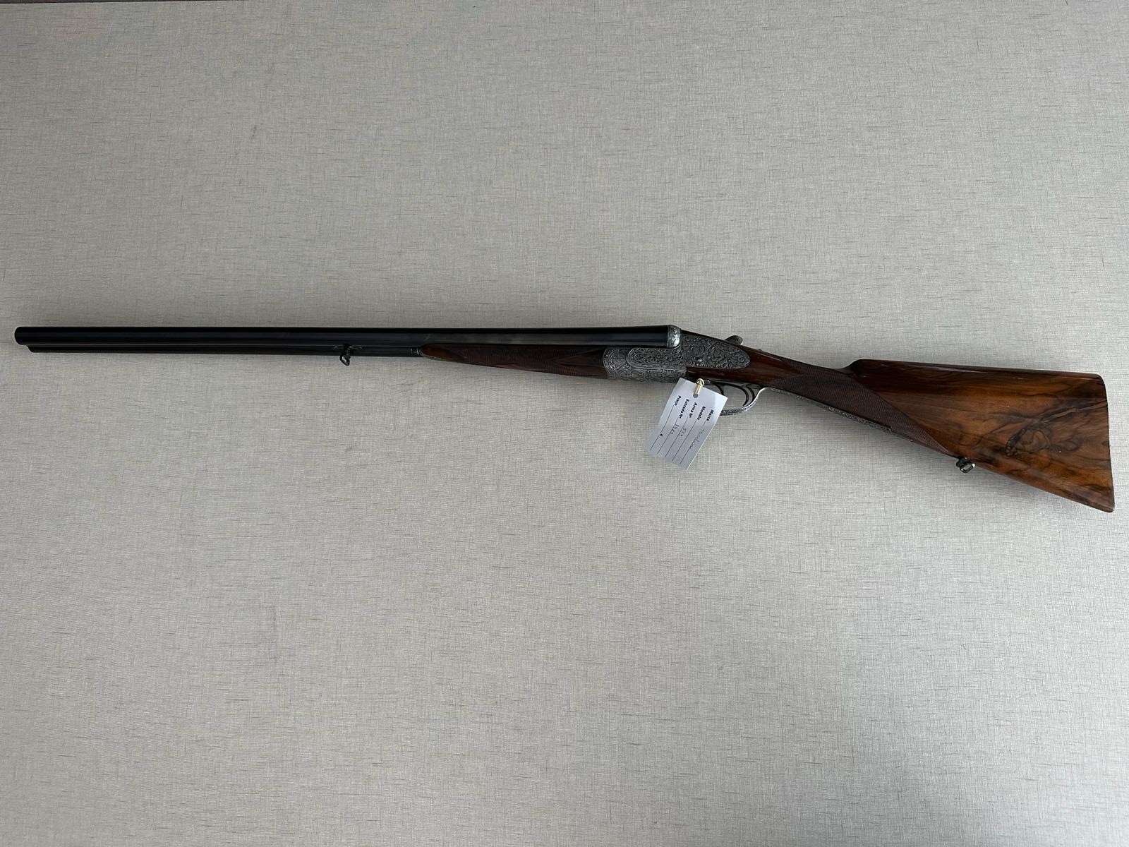Espingarda de canos duplos com detalhes em metal gravado sobre fundo bege