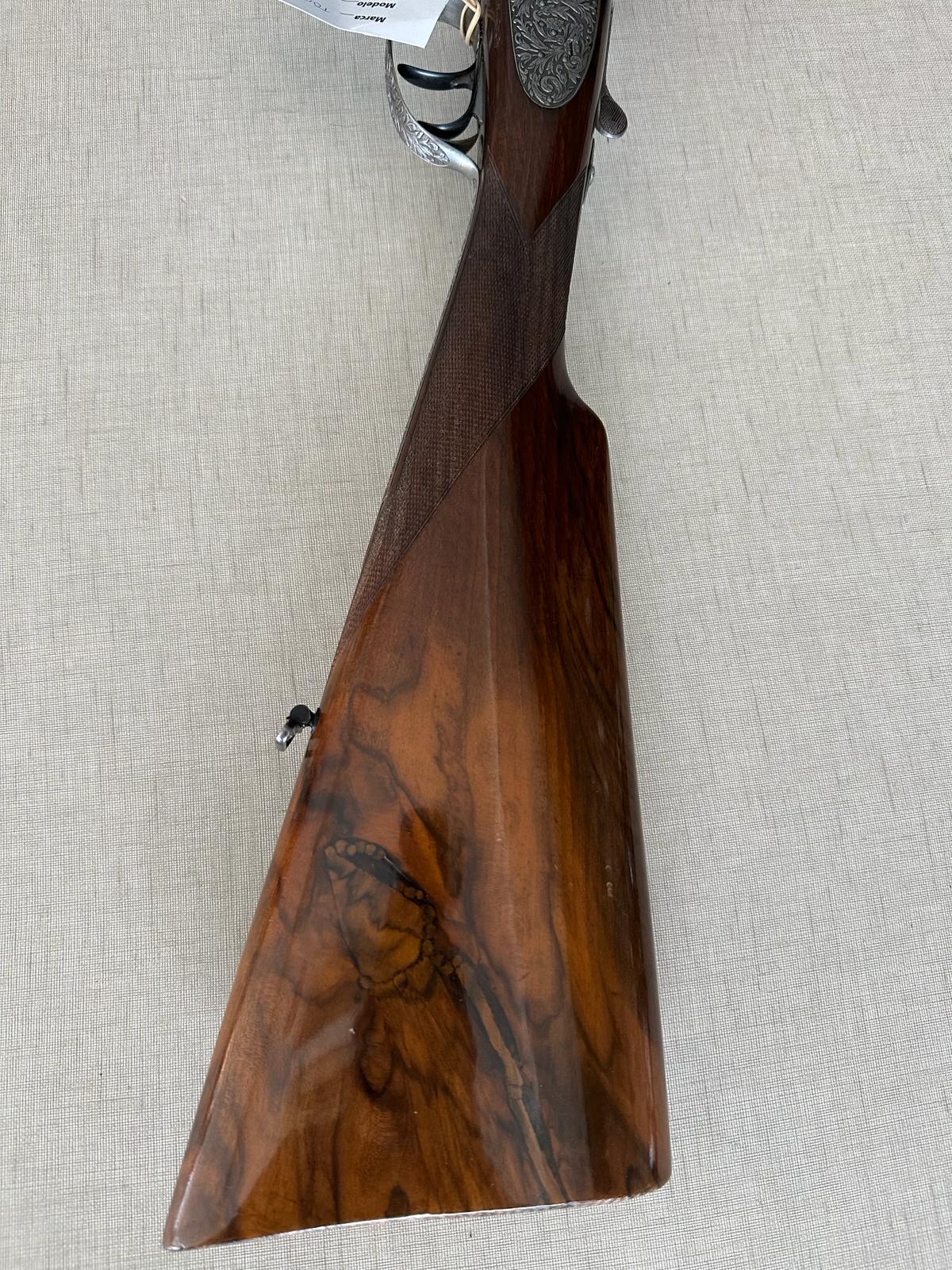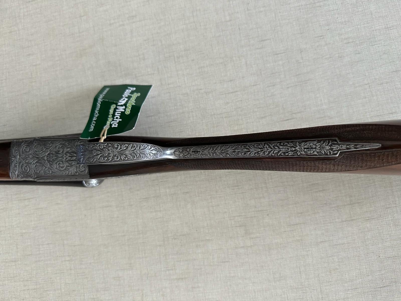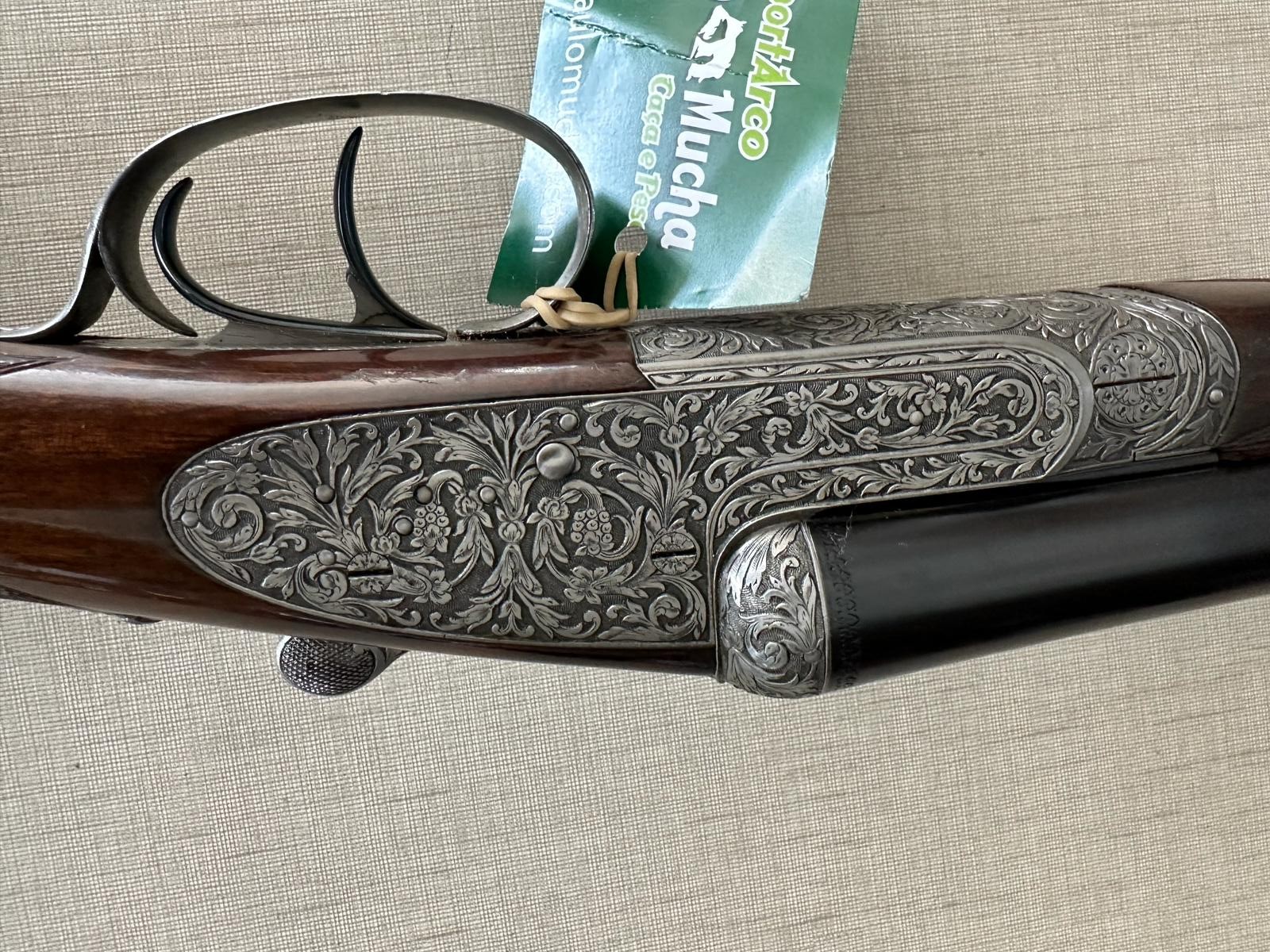 detalle da arma de caça com madeira escura e metal gravado com etiqueta verde
