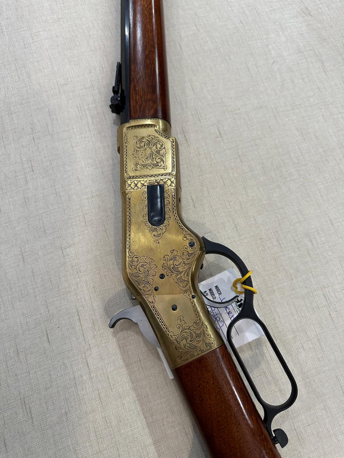 Espingarda dourada gravada com cabo de madeira castanha sobre superfície clara