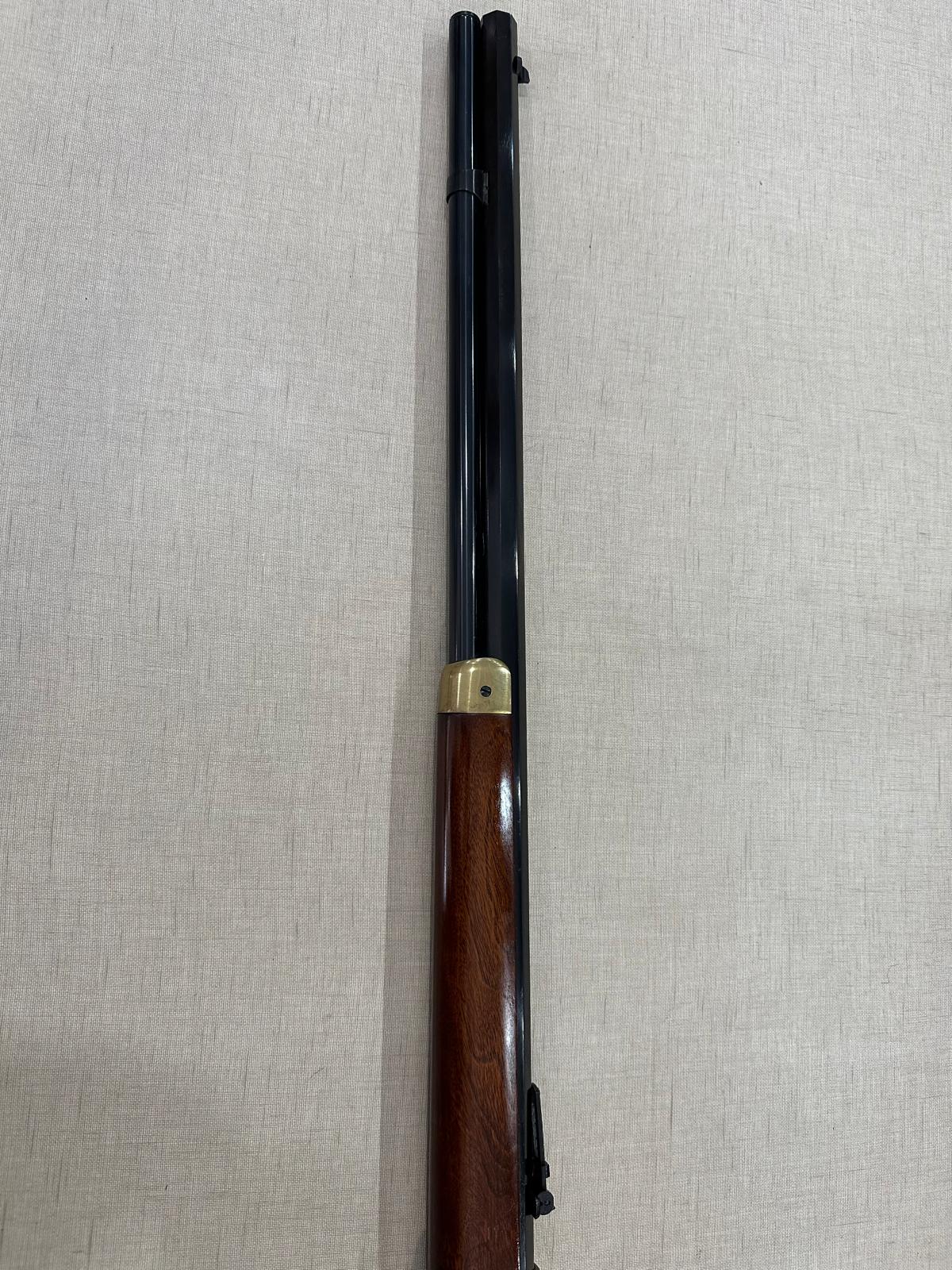 Cano duplo de arma de fogo com detalhes em preto, madeira castanha e metal dourado sobre tecido bege.