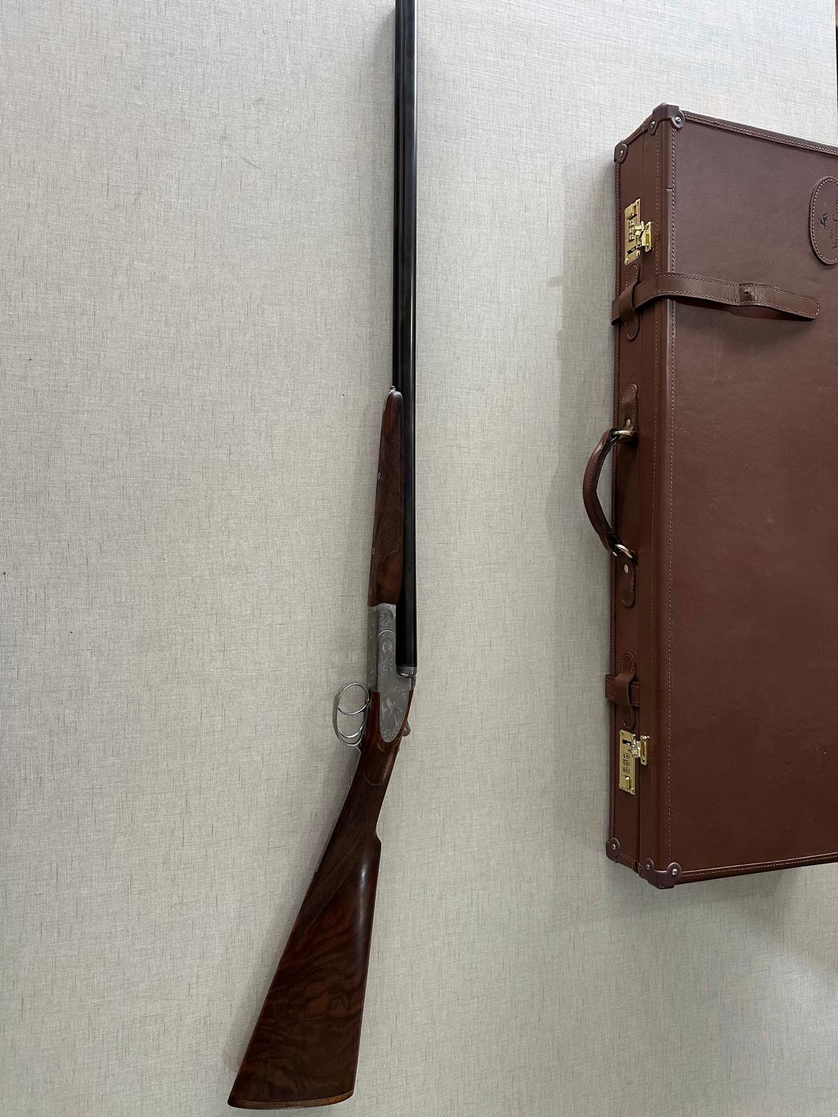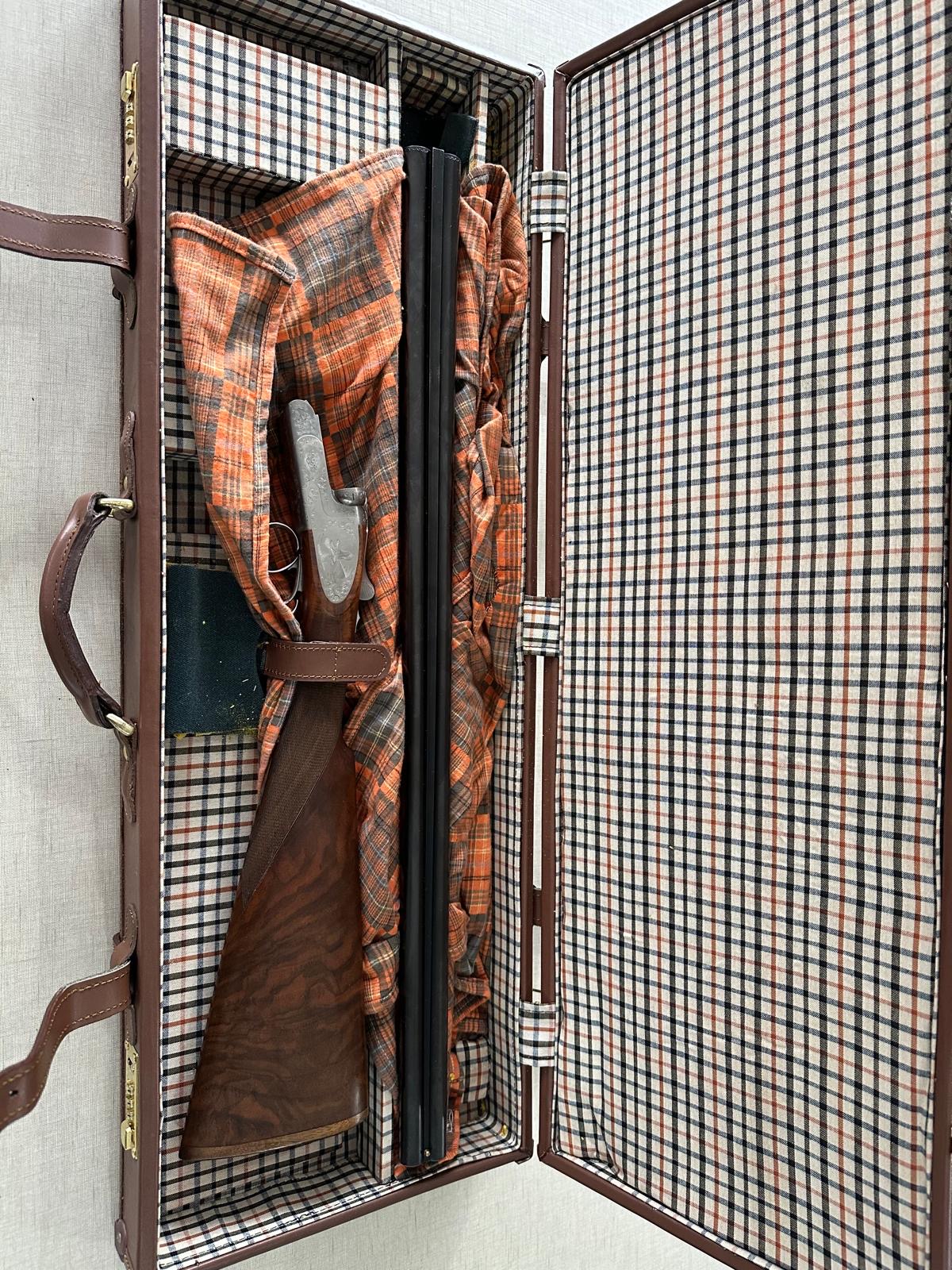 Espingarda de canos duplos com coronha de madeira escura e mala castanha de transporte