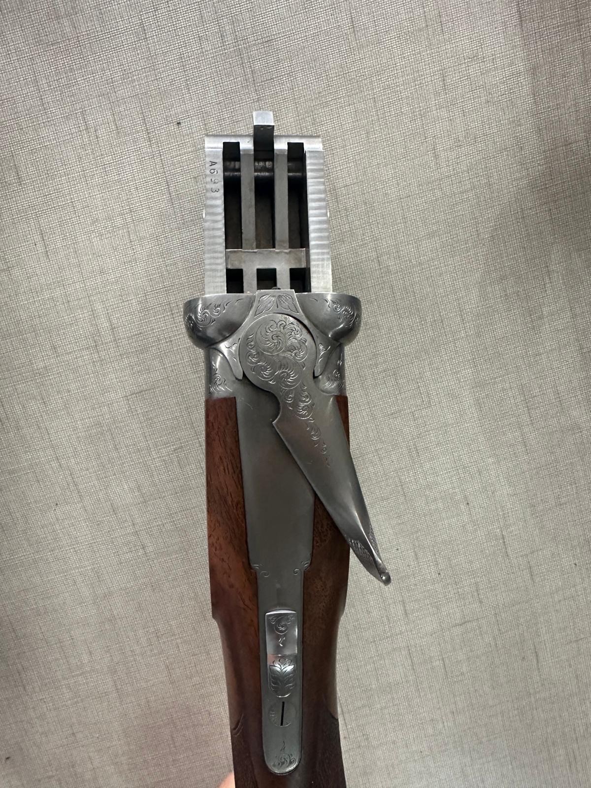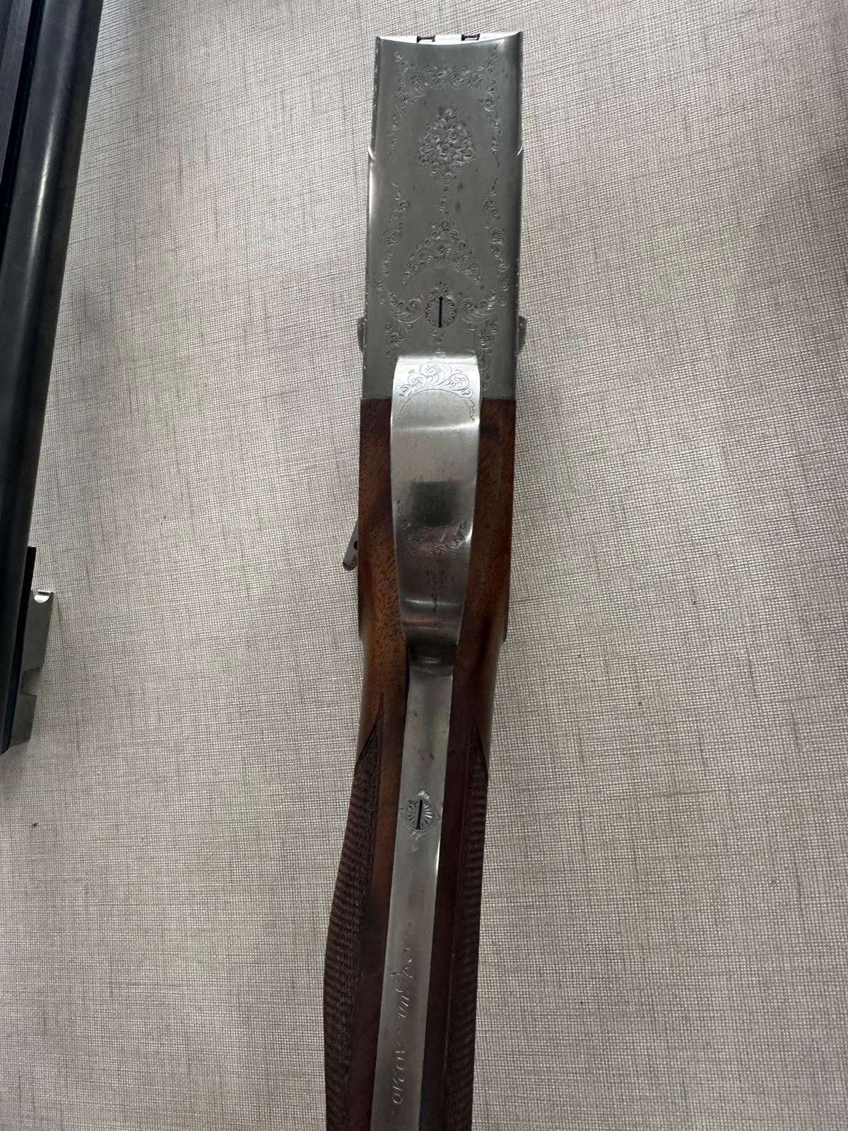 Arma de fogo de cano duplo aberta com cabo de madeira e metal gravado, sobre tecido cinza.
