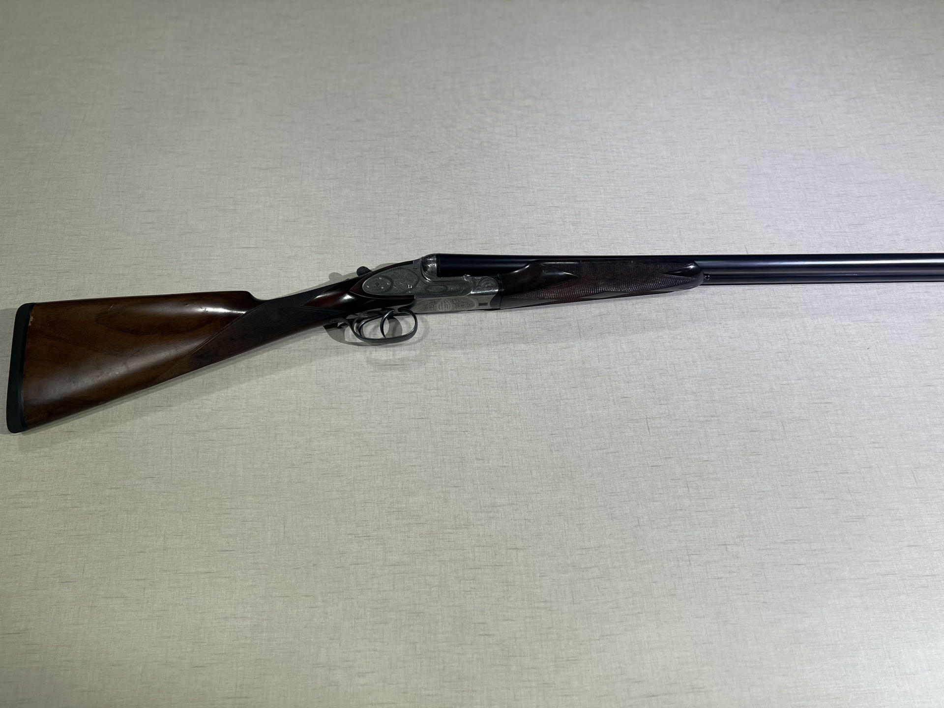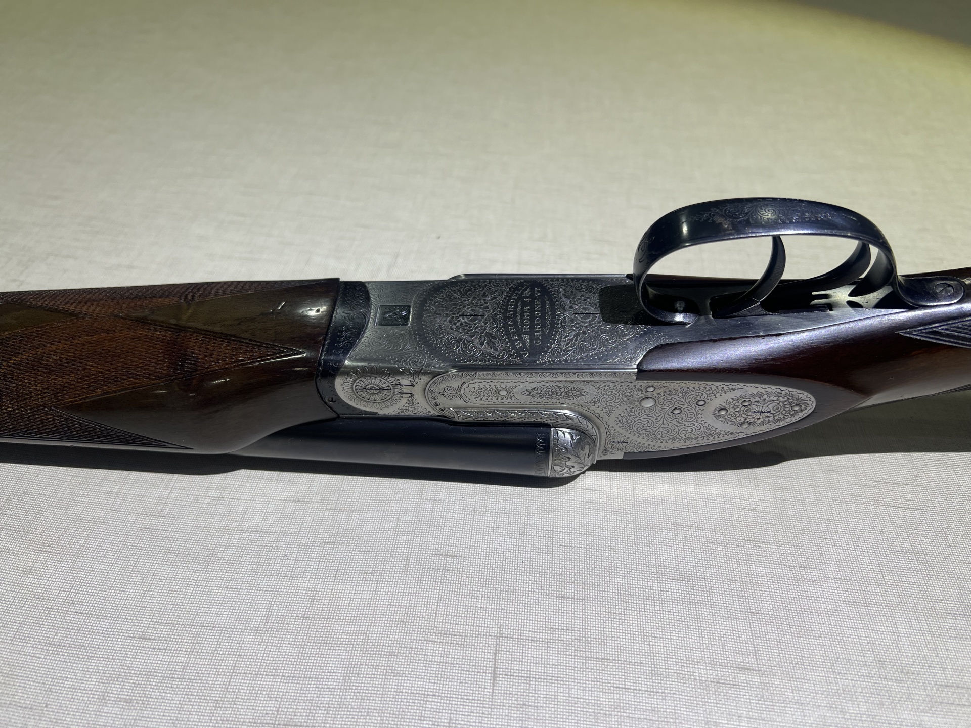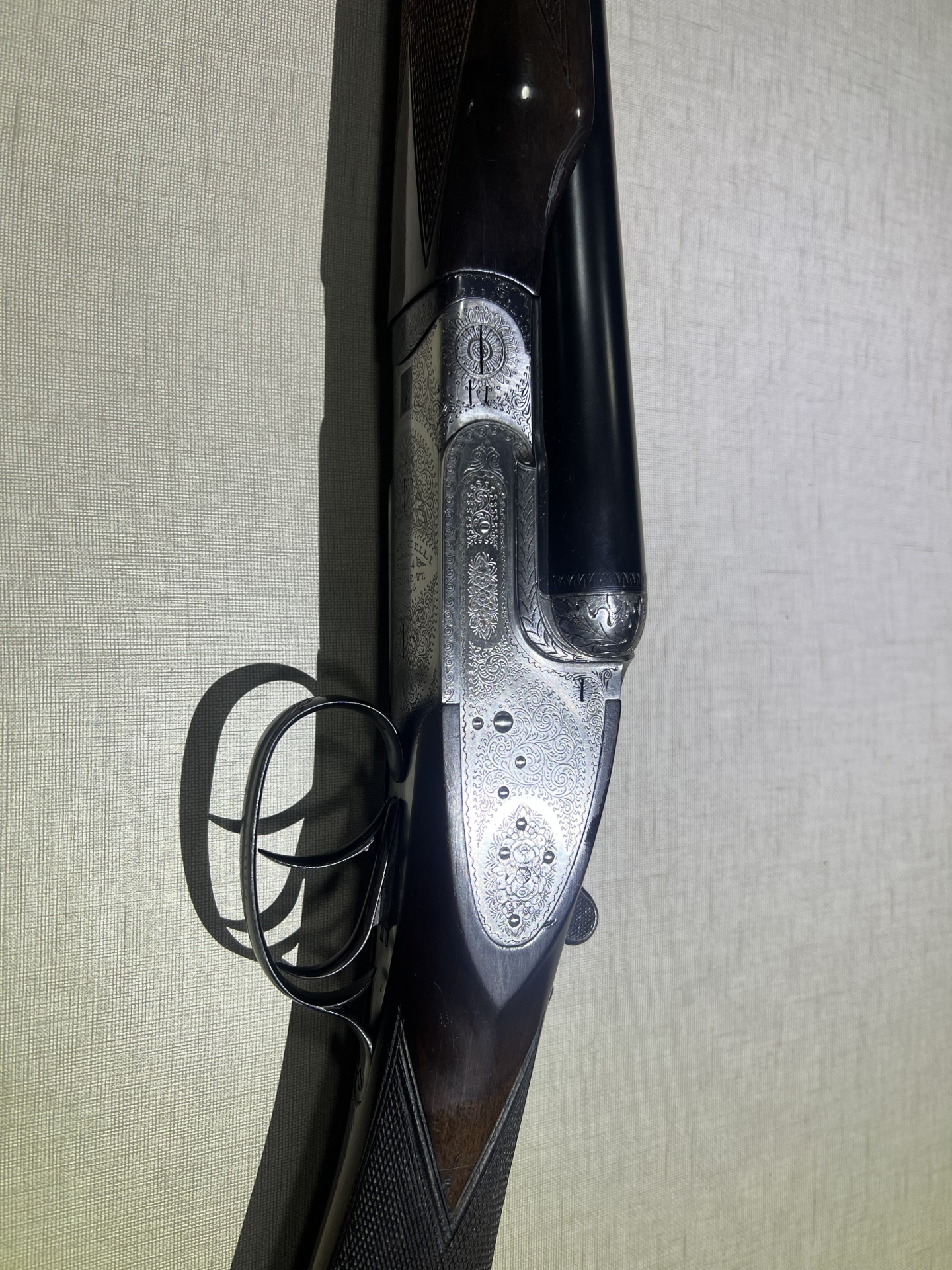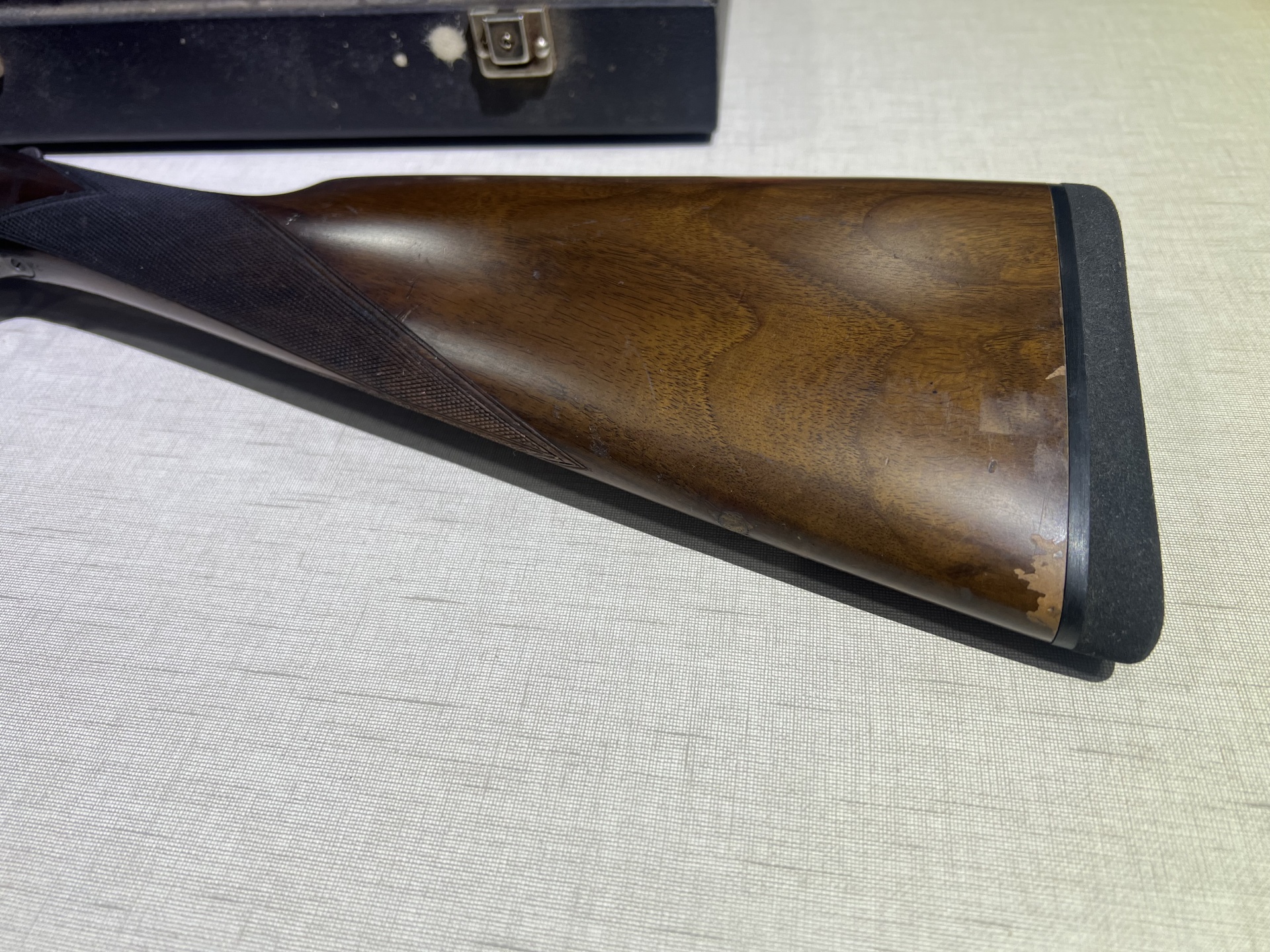 Espingarda de cano duplo com detalhes em madeira e metal gravado