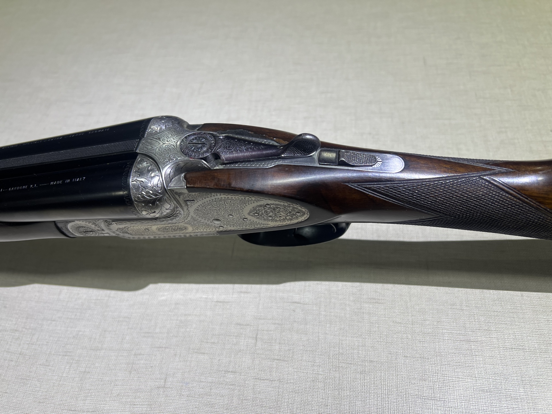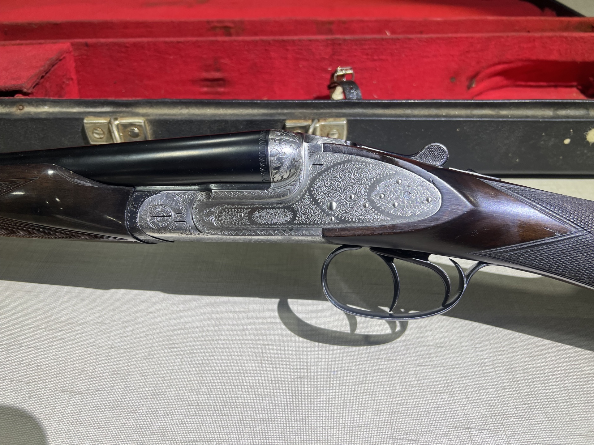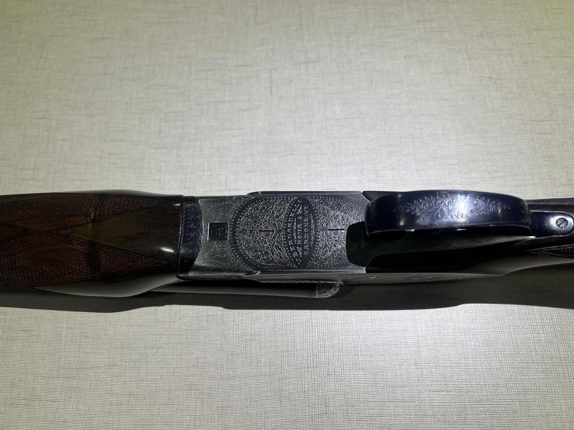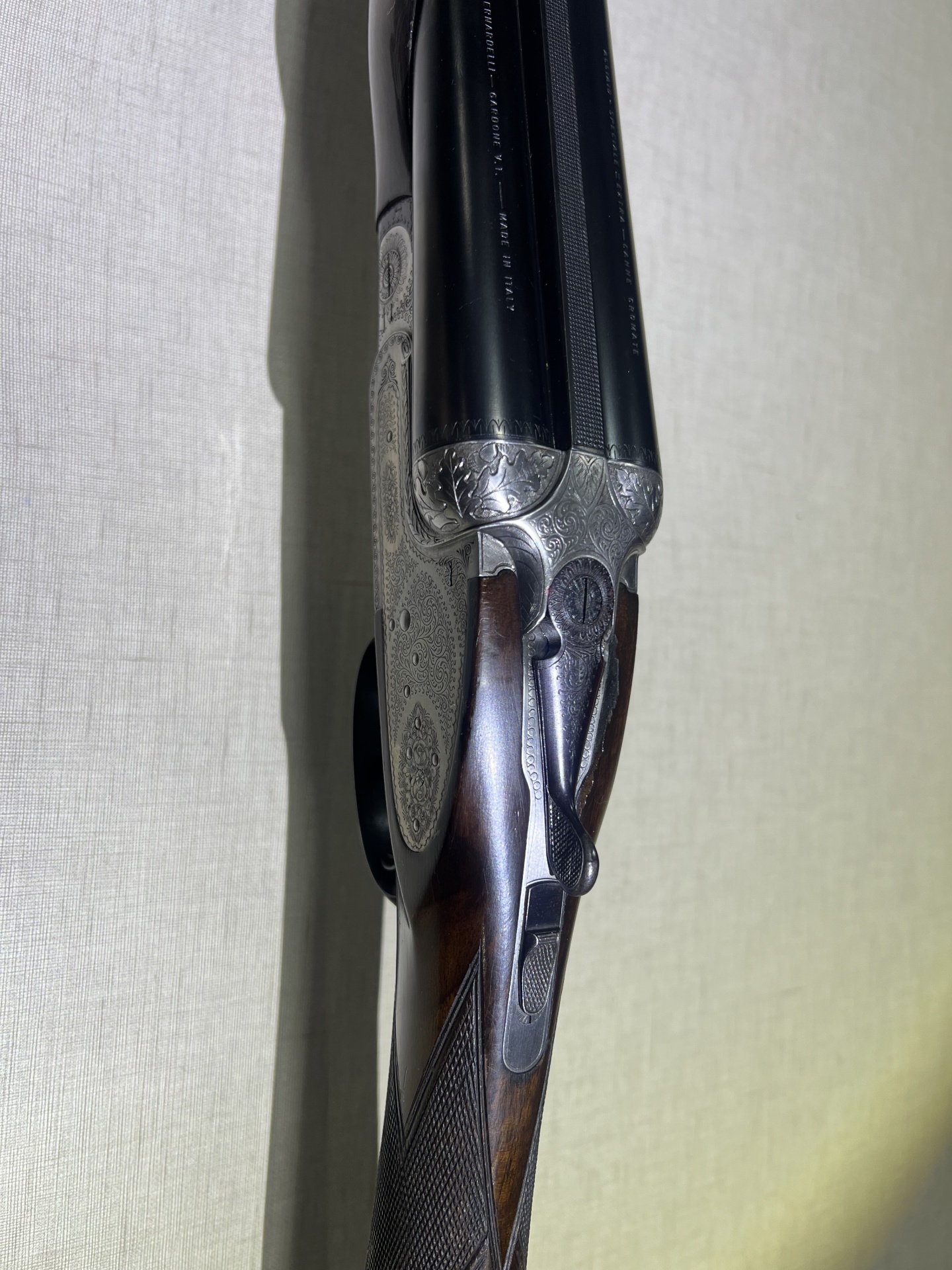 Espingarda de canos duplos com detalhes gravados e coronha de madeira escura