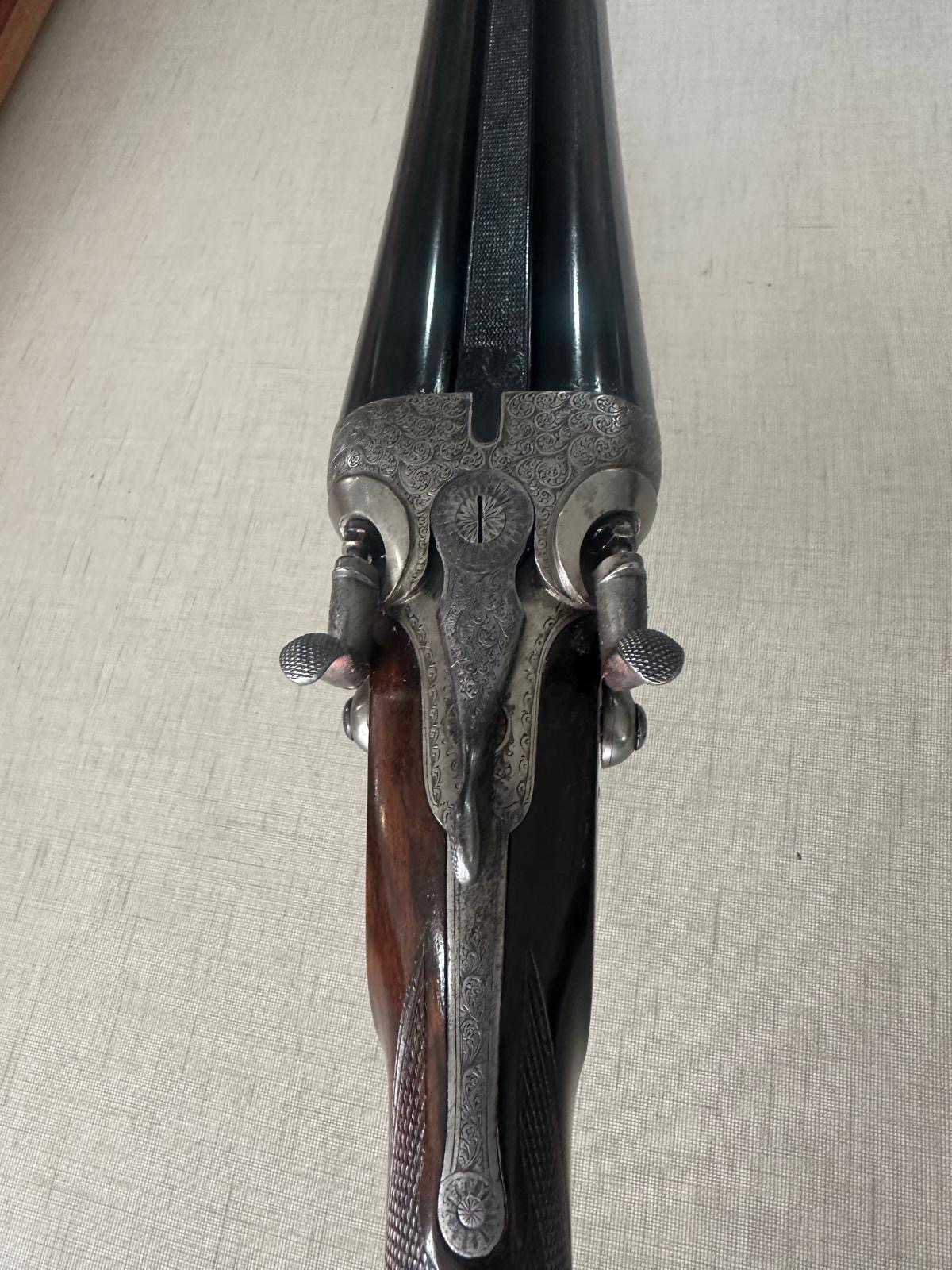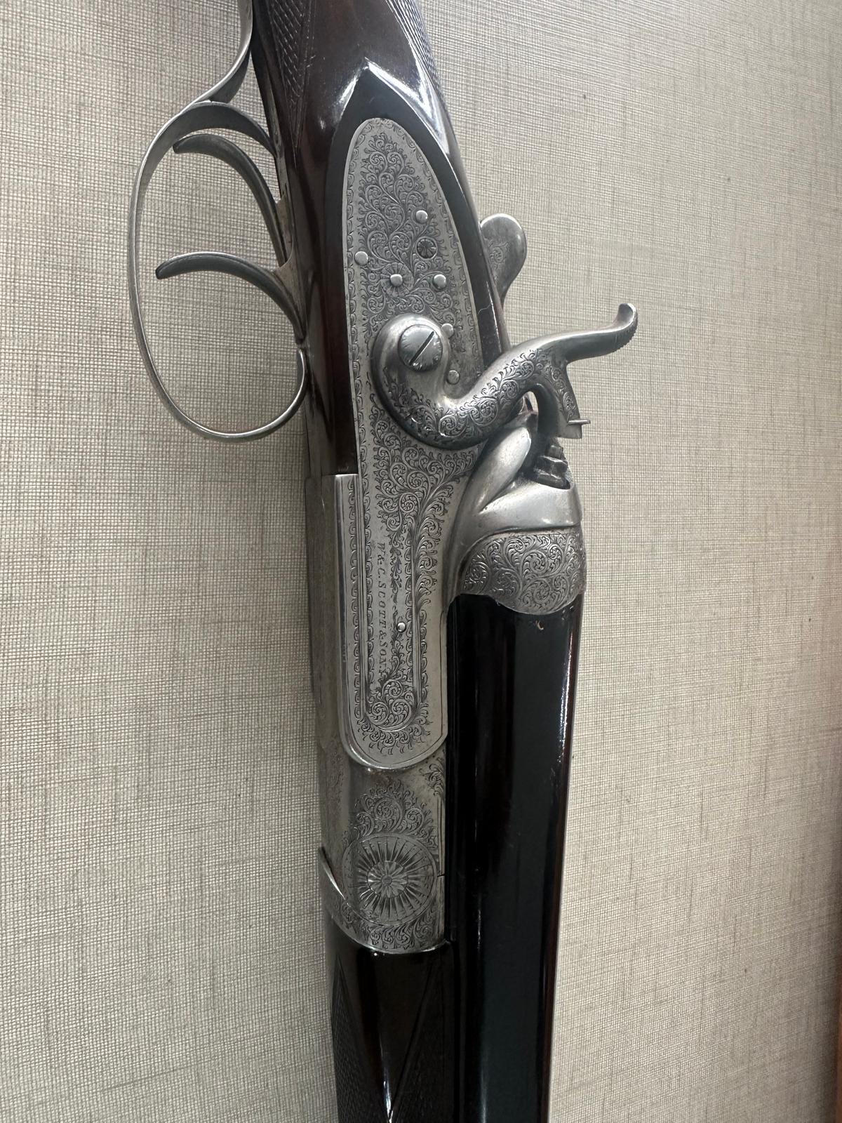 Espingarda de canos duplos com detalhes em metal gravado e madeira escura