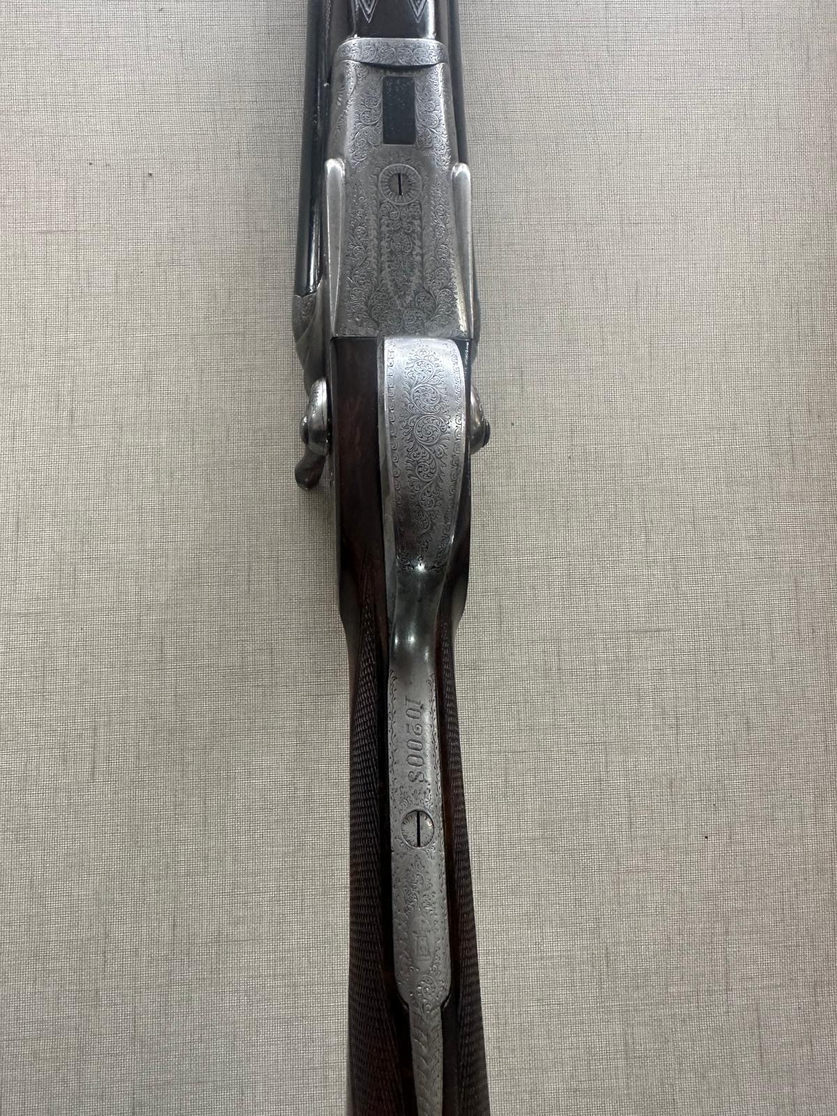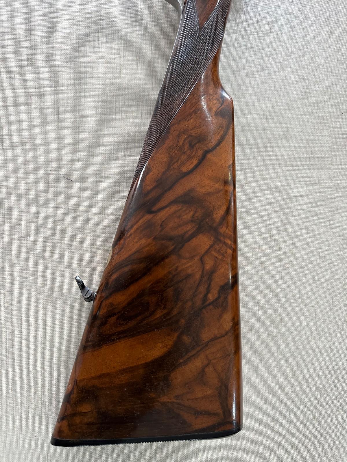Espingarda de canos duplos com detalhes em madeira e metal gravado