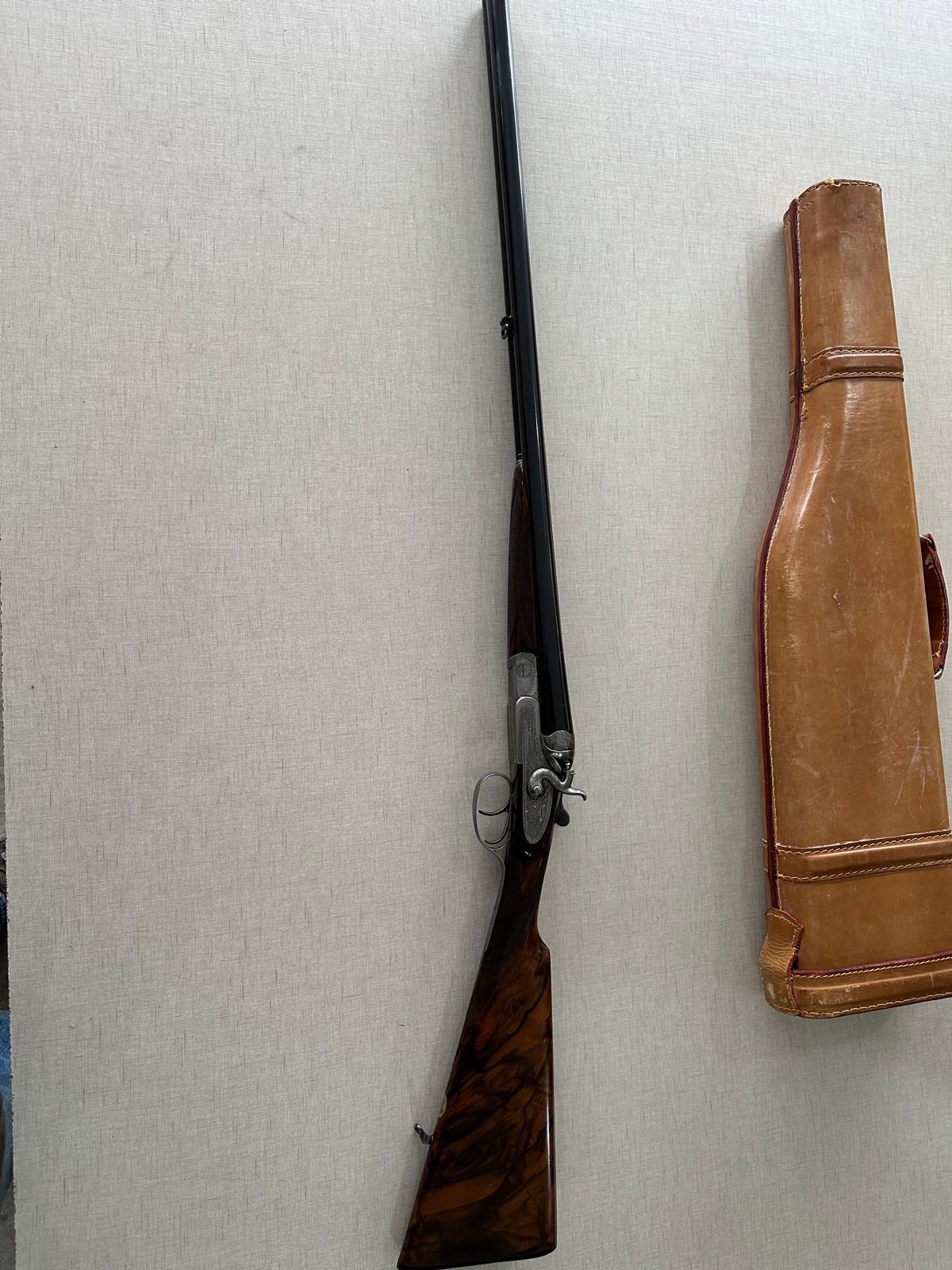 Espingarda de canos duplos com coronha de madeira escura e estojo de couro castanho pendurados na parede