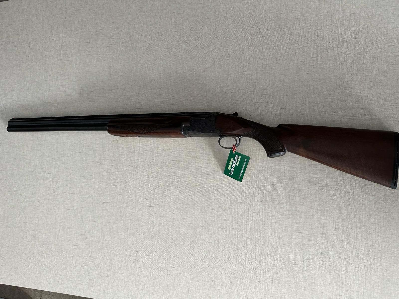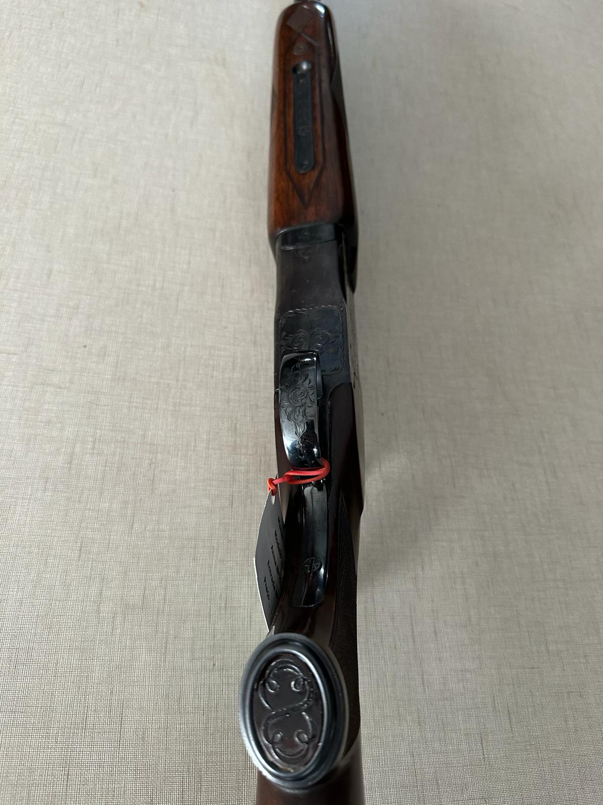 Espingarda de canos duplos e madeira com etiqueta verde pendurada