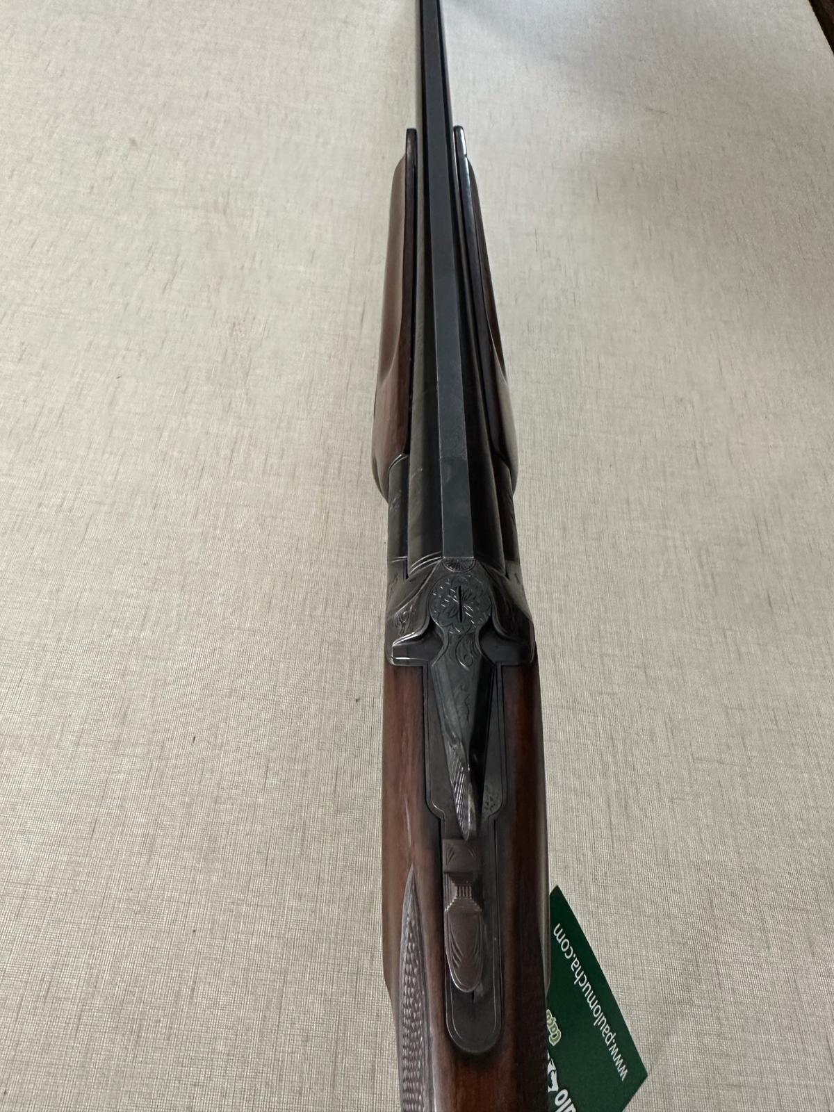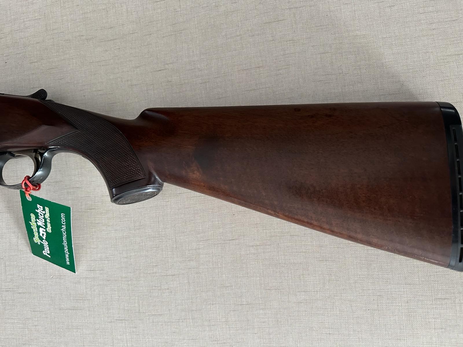 Rifle de caça de cano duplo com acabamentos em madeira e metal cinzento, etiqueta verde Palomucha