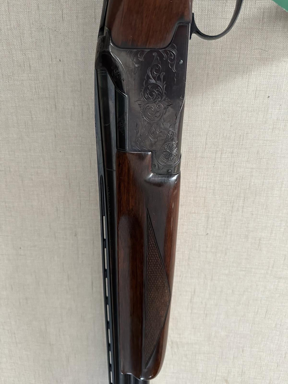 Espingarda de cano duplo com detalhes gravados e madeira castanha