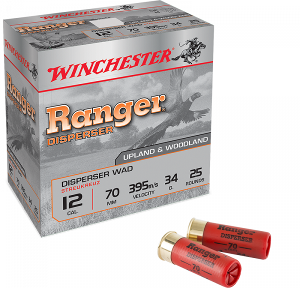 Caixa e duas munições Winchester Ranger Disperser calibre 12 de cor vermelha