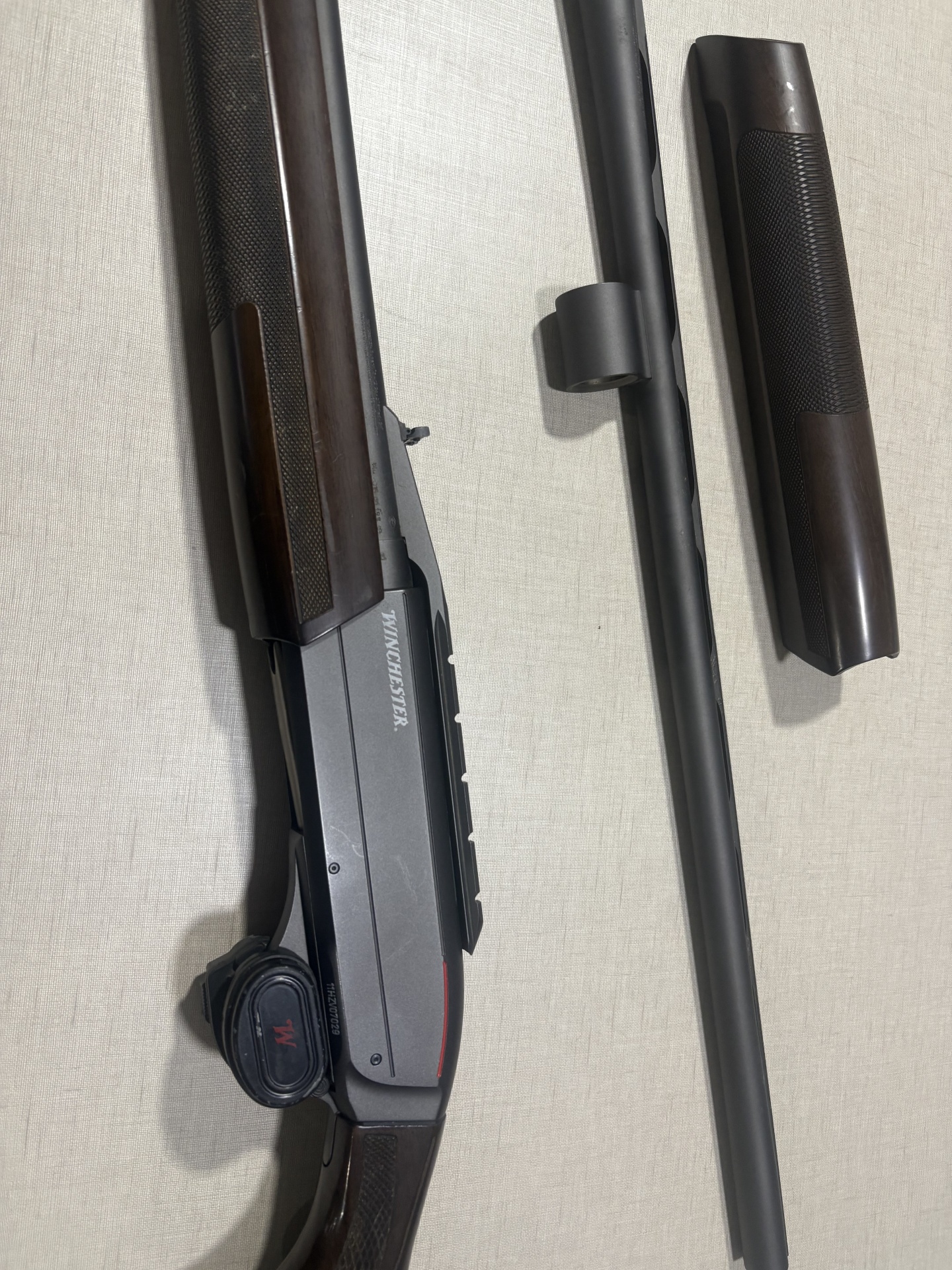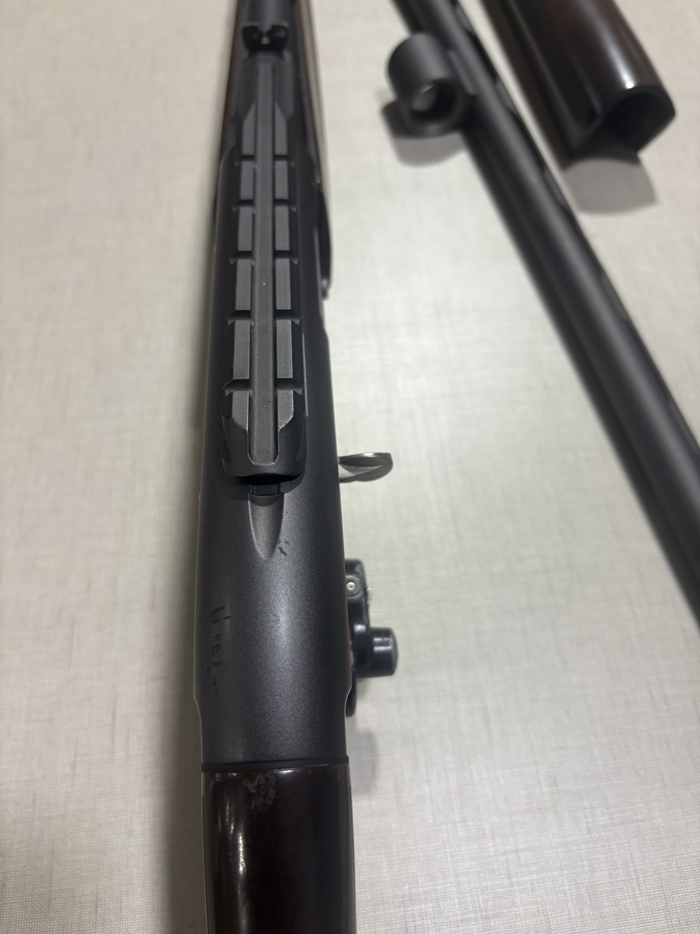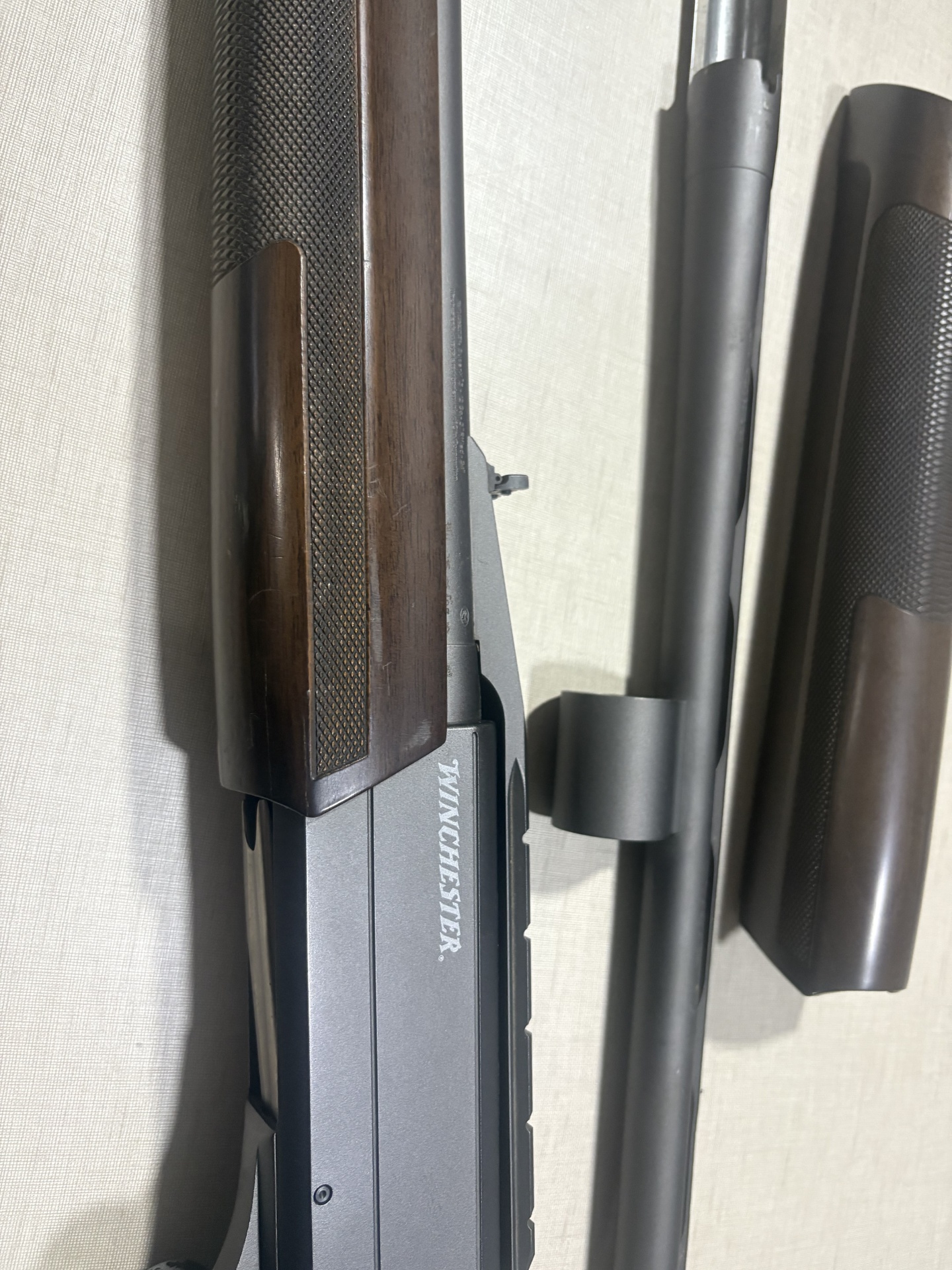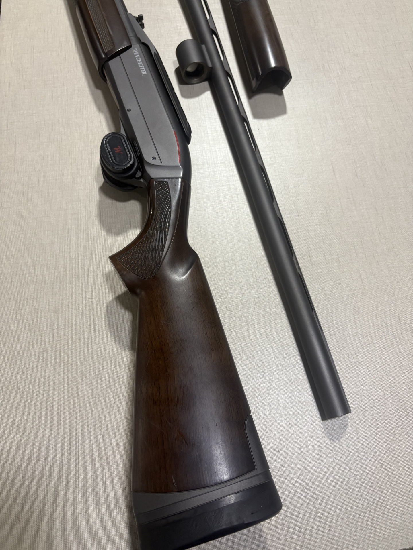 Espingarda de caça Winchester com madeira escura e cano metálico preto removível em fundo claro