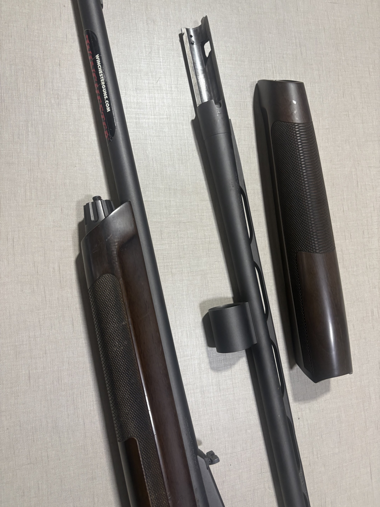 Peças de espingarda desmantelada em metal preto e madeira escura com texto WINCHESTERGUNS.COM