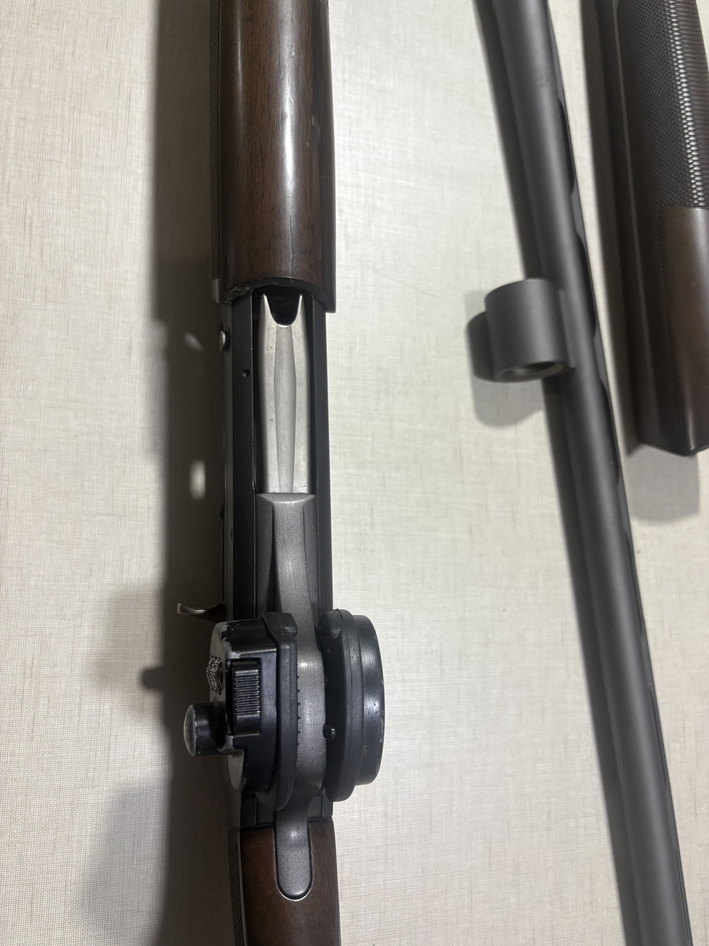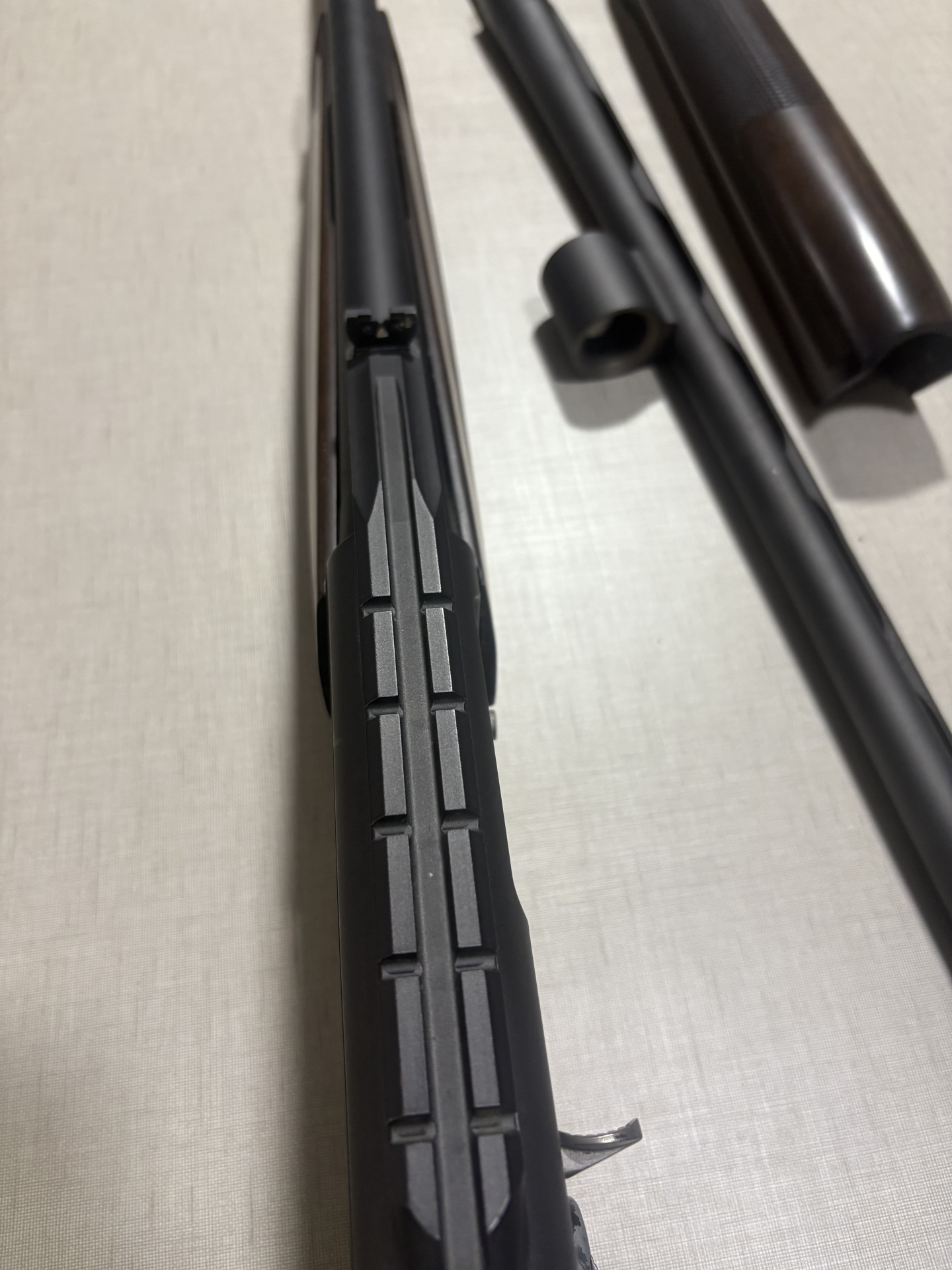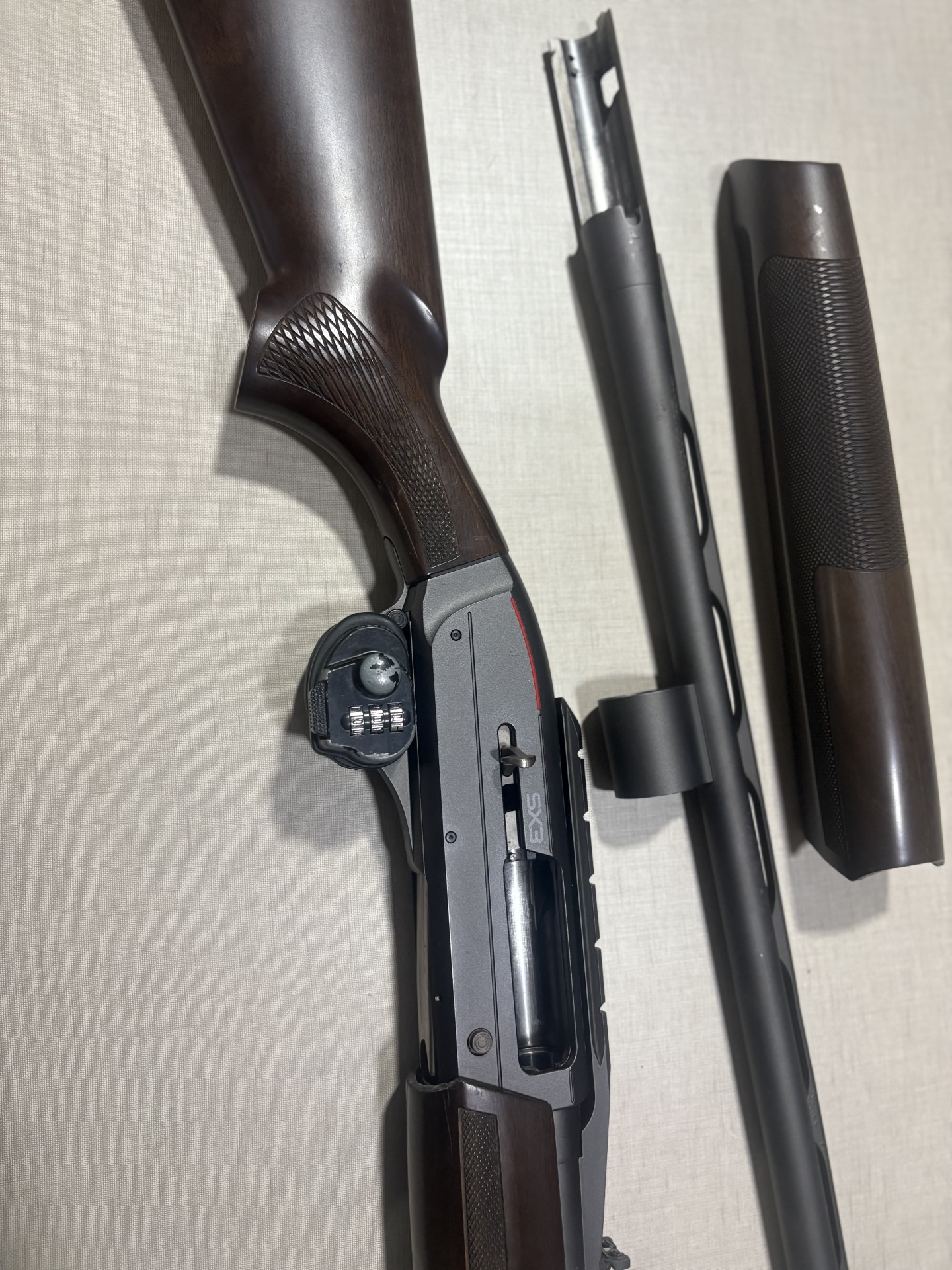 Espingarda de caça desmontada com coronha em madeira escura e cano em metal preto fosco