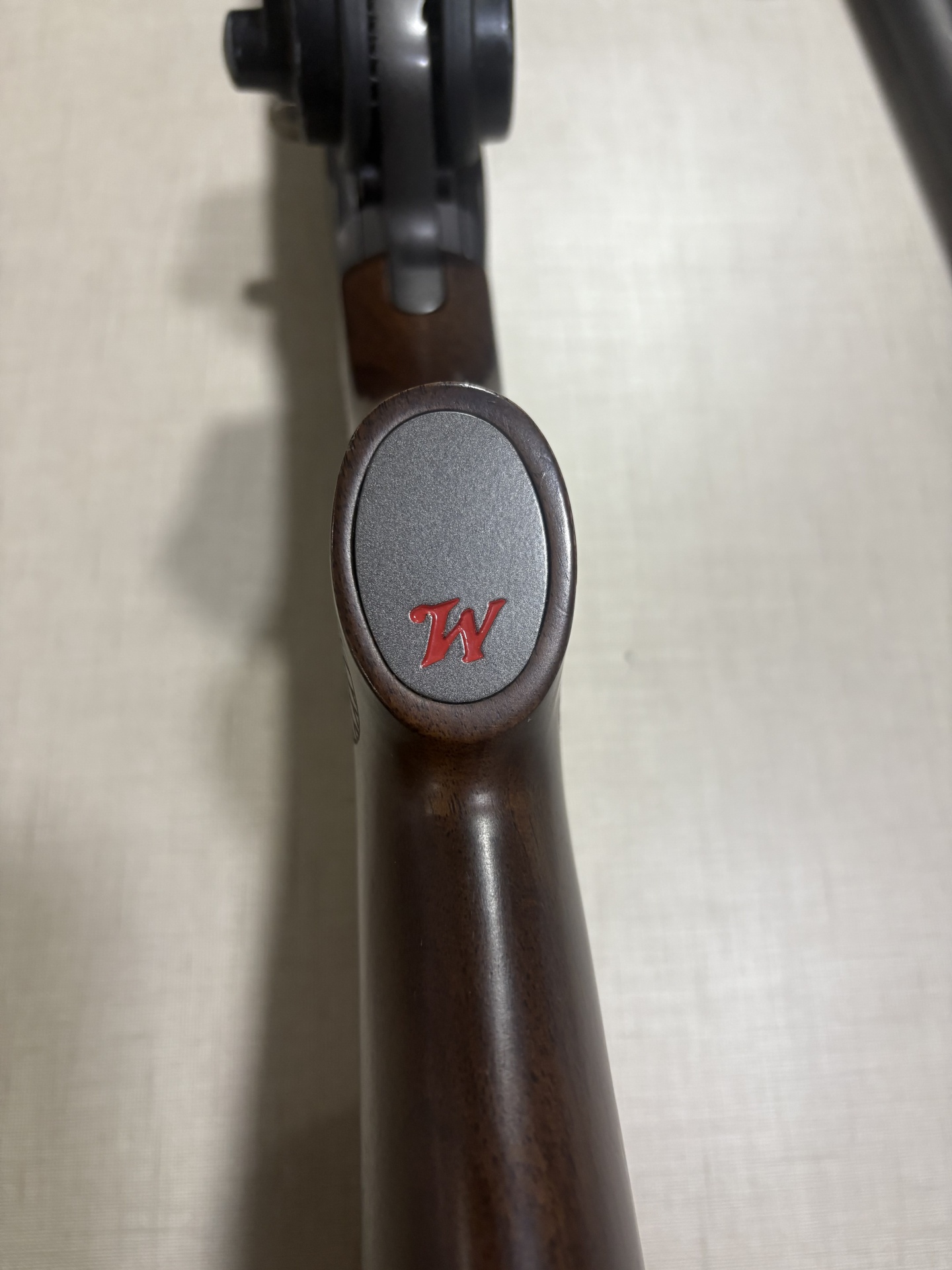 Coronha de espingarda em madeira castanha com placa metálica cinza e letra vermelha W